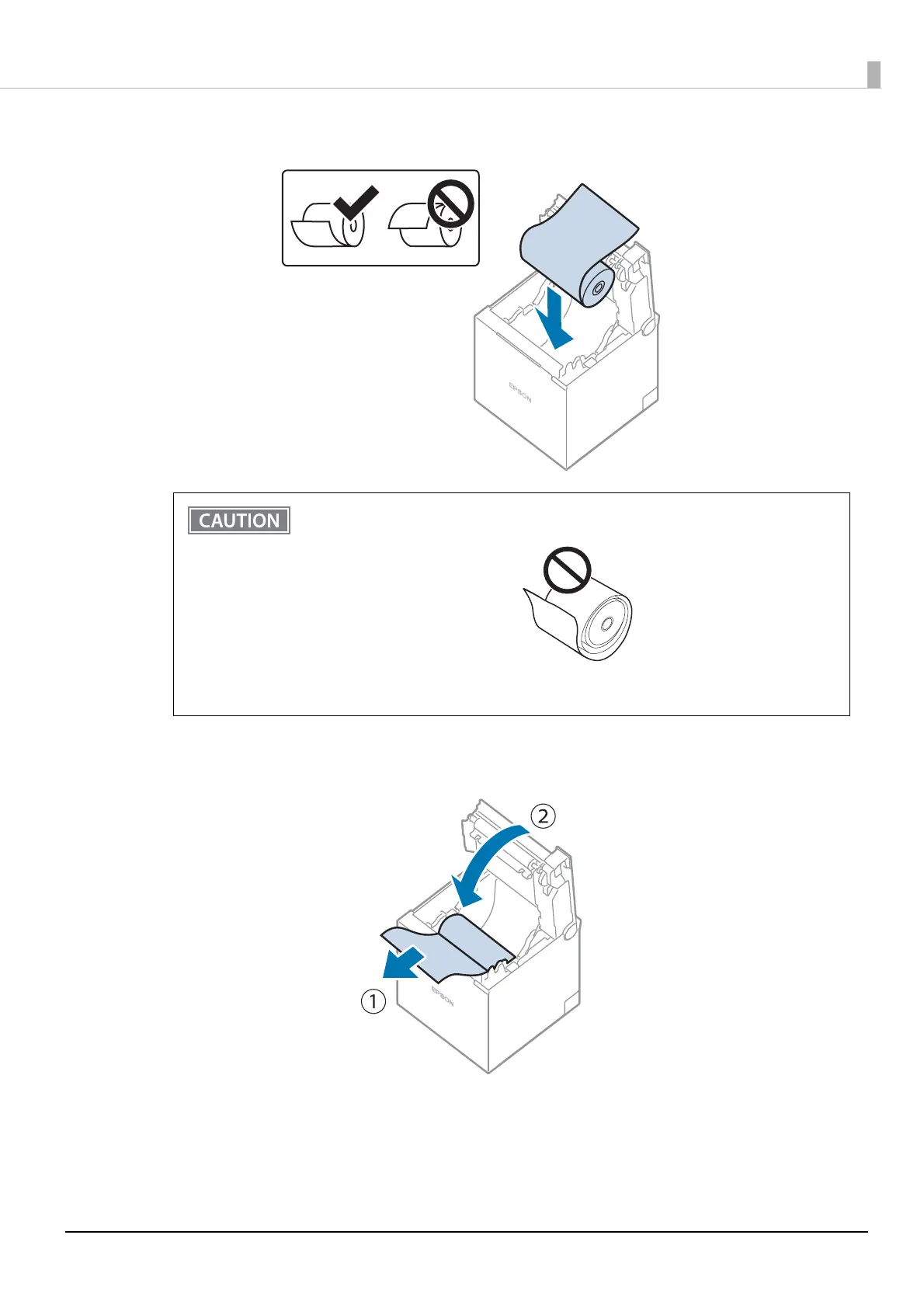 • Before installing the roll paper, take up any slack in the roll paper by pulling its leading