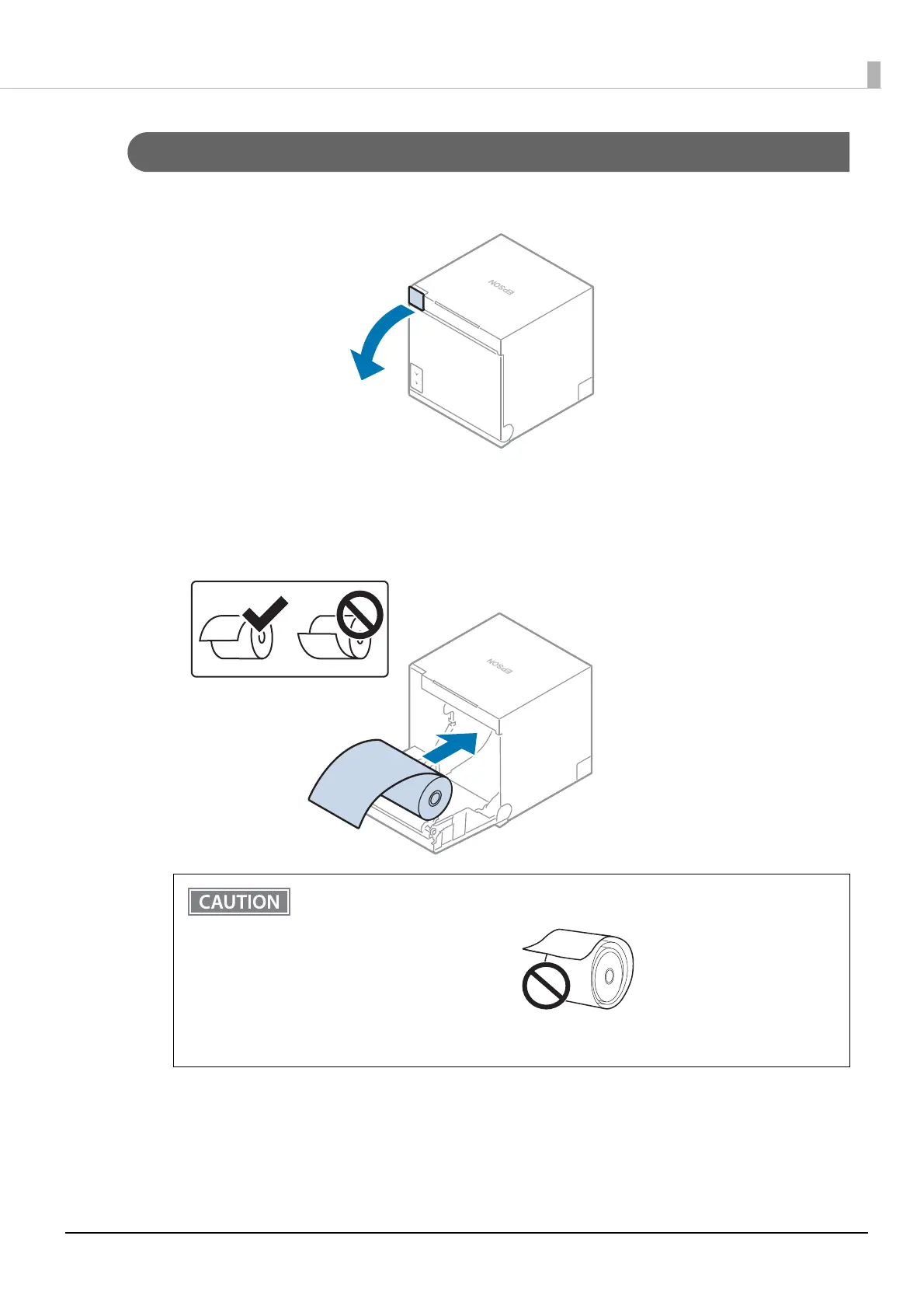 • Before installing the roll paper, take up any slack in the roll paper by pulling its leading