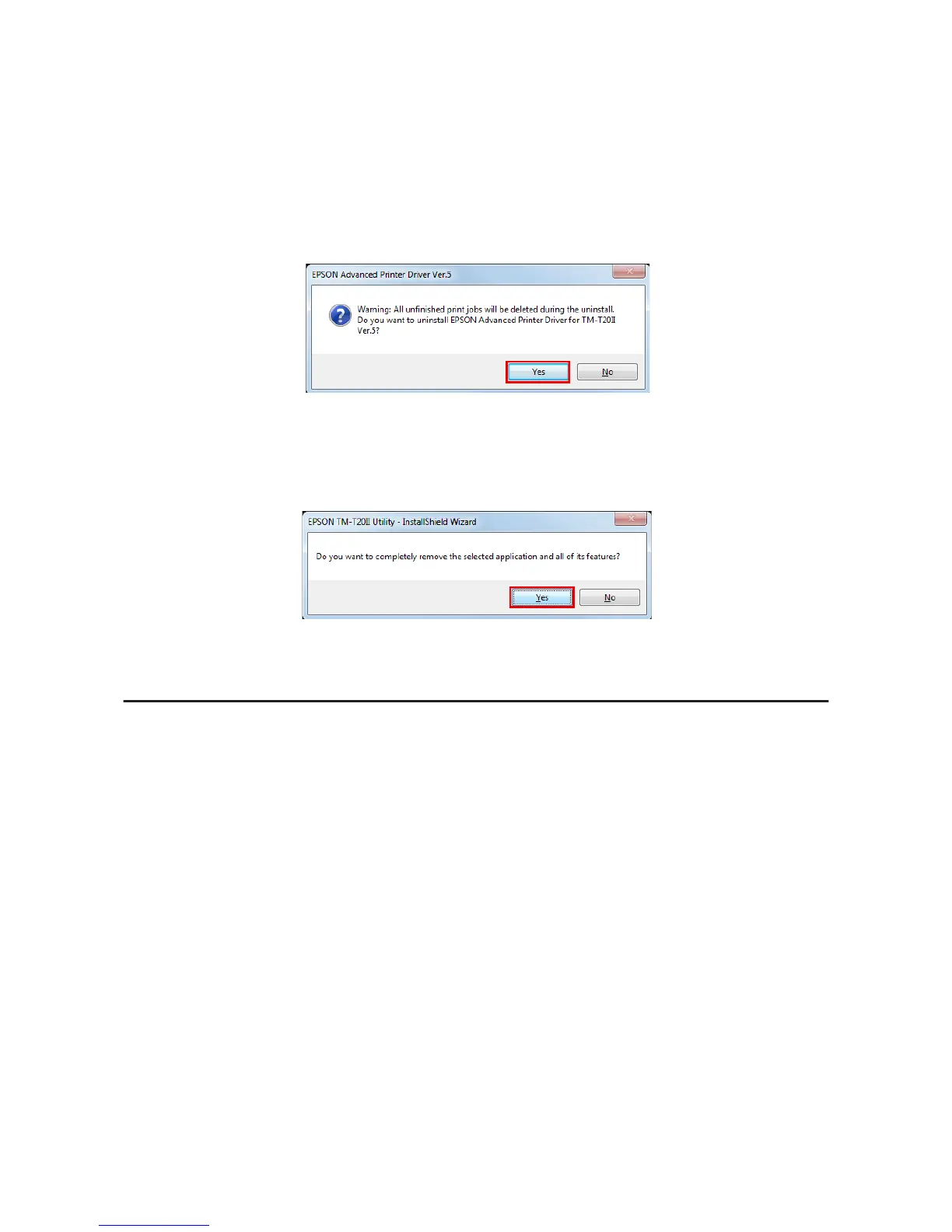 The TM-T20II Utility uninstallation confirmation screen appears. Click the Yes button.