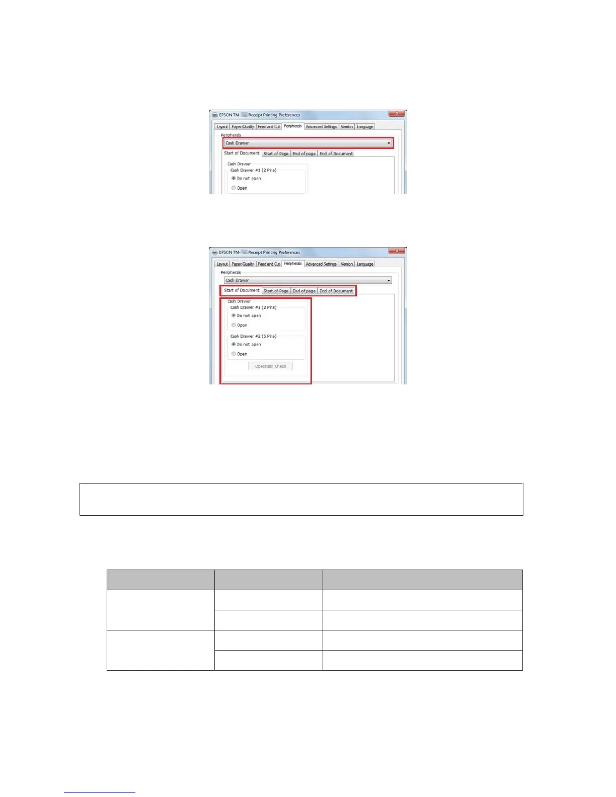 Settings of cash drawer are shown below.