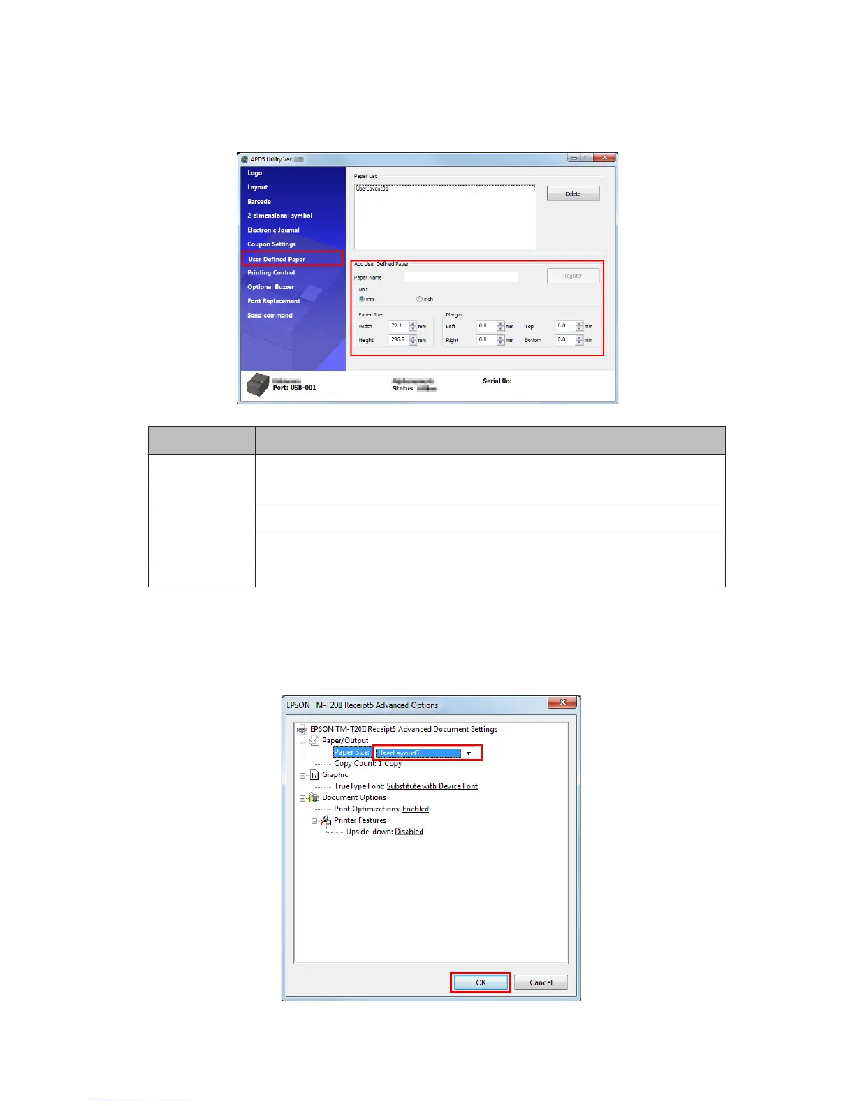 Select User Defined Paper of the APD5 utility to setup user defined paper.
