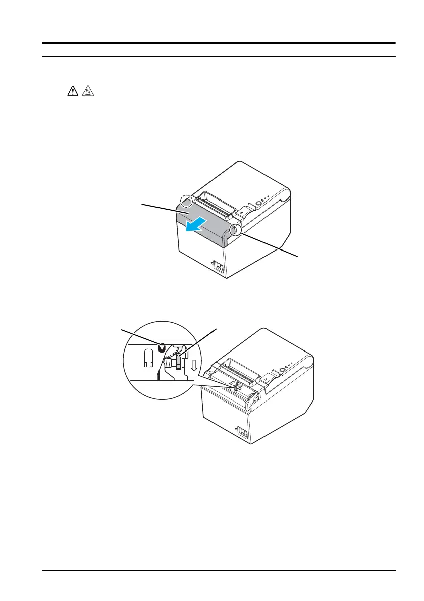 When a paper jam occurs, never pull out the paper forcibly. Open the roll paper cover and