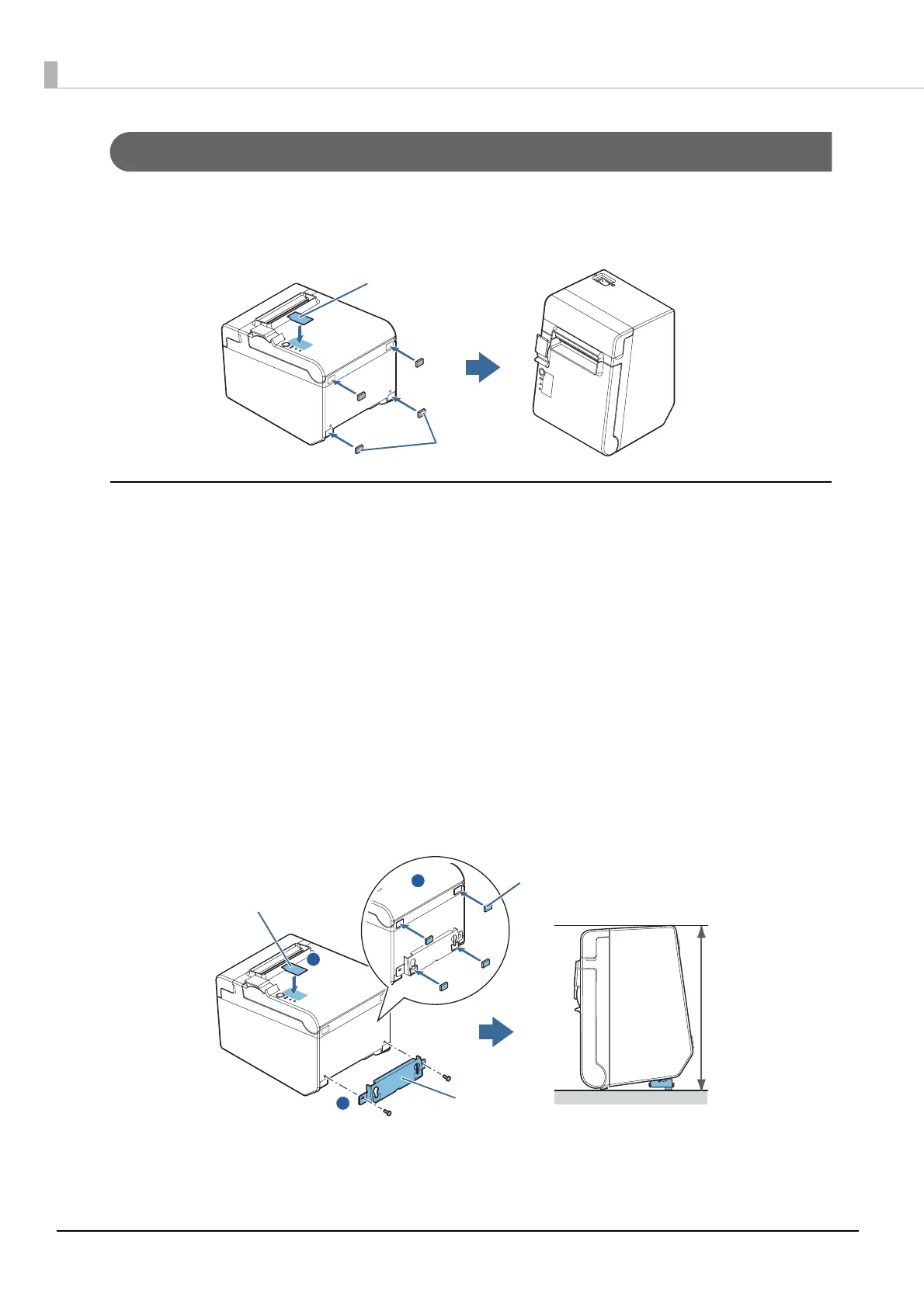 installation on the roll paper cover, and attach 4 rubber feet in the rectangular indents in the printer