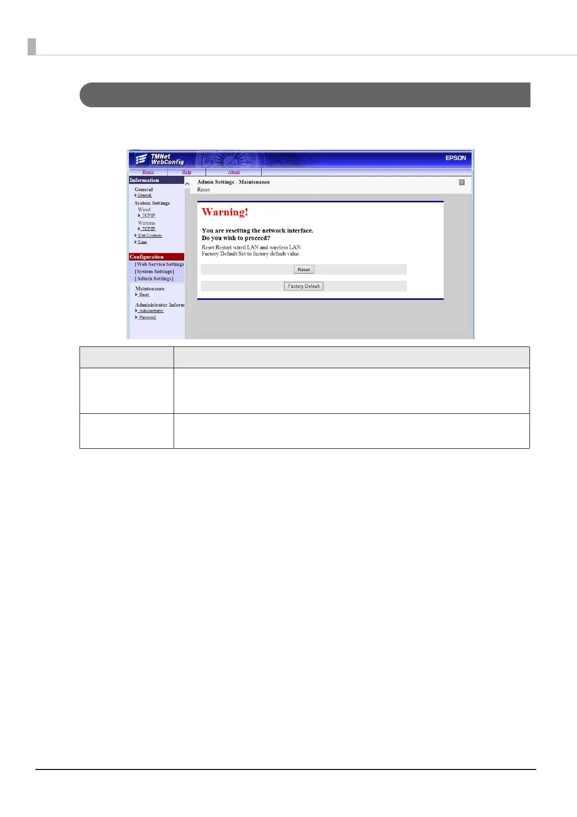 Factory Default Restores the settings for EPSON TMNet WebConfig to the factory default settings.