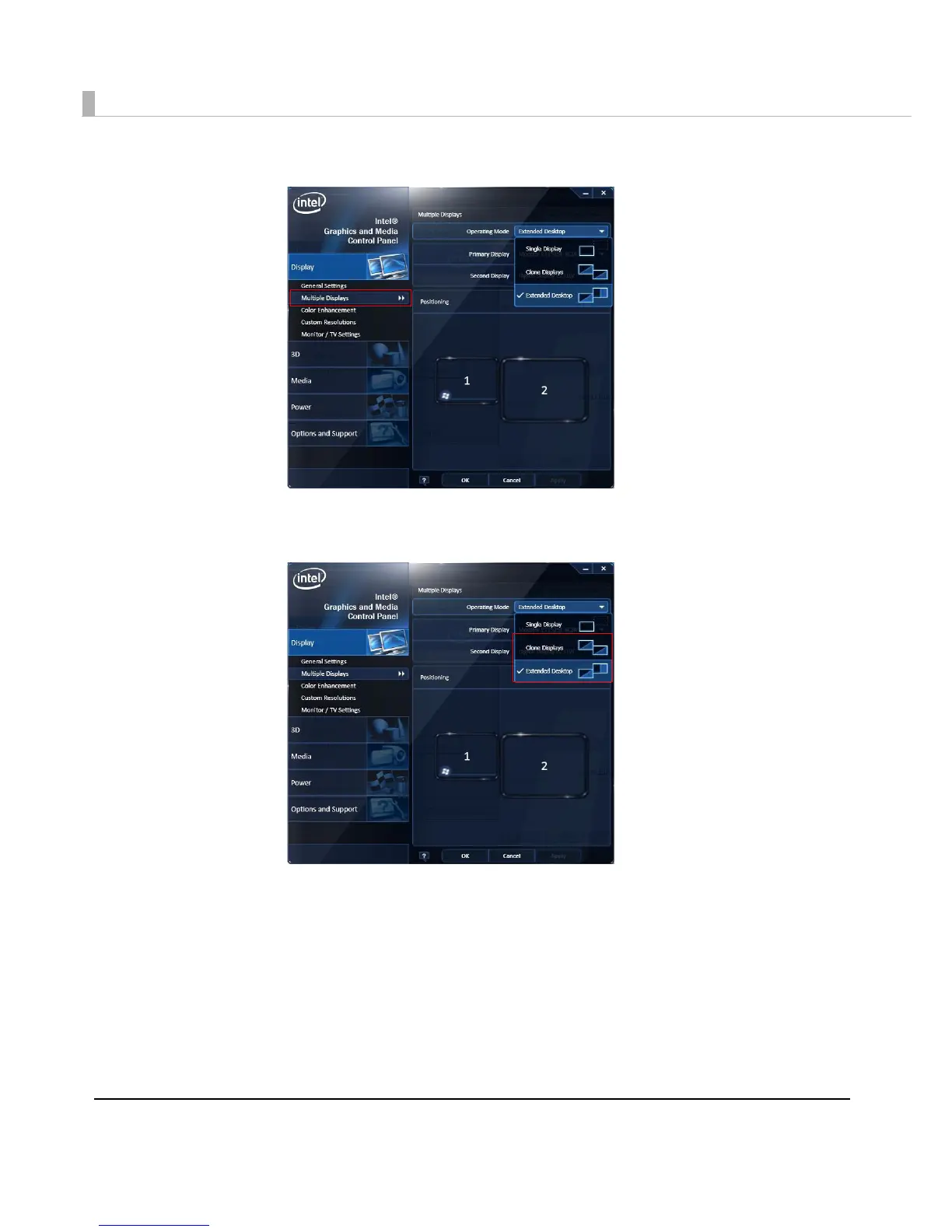 From the "Oparating Mode" list, select "Clone Displays" or "Extended