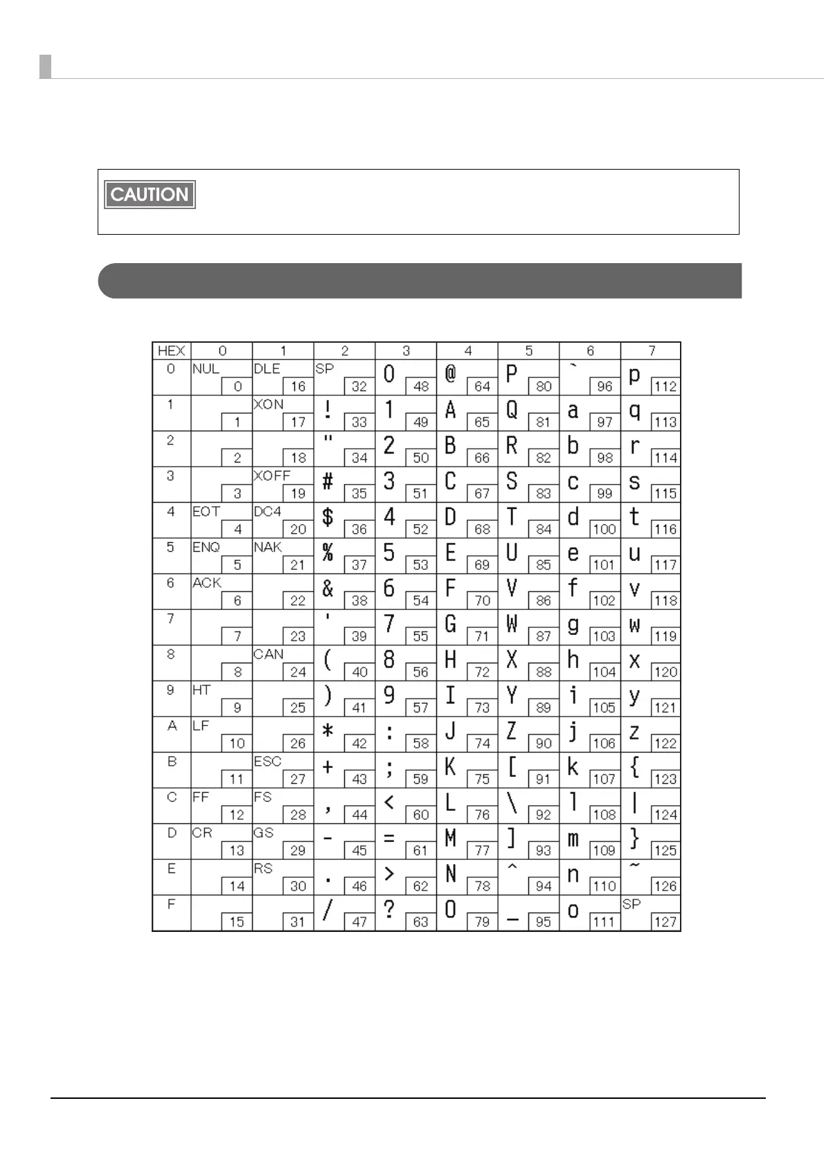 The character code tables show only character configurations. They do not show the actual