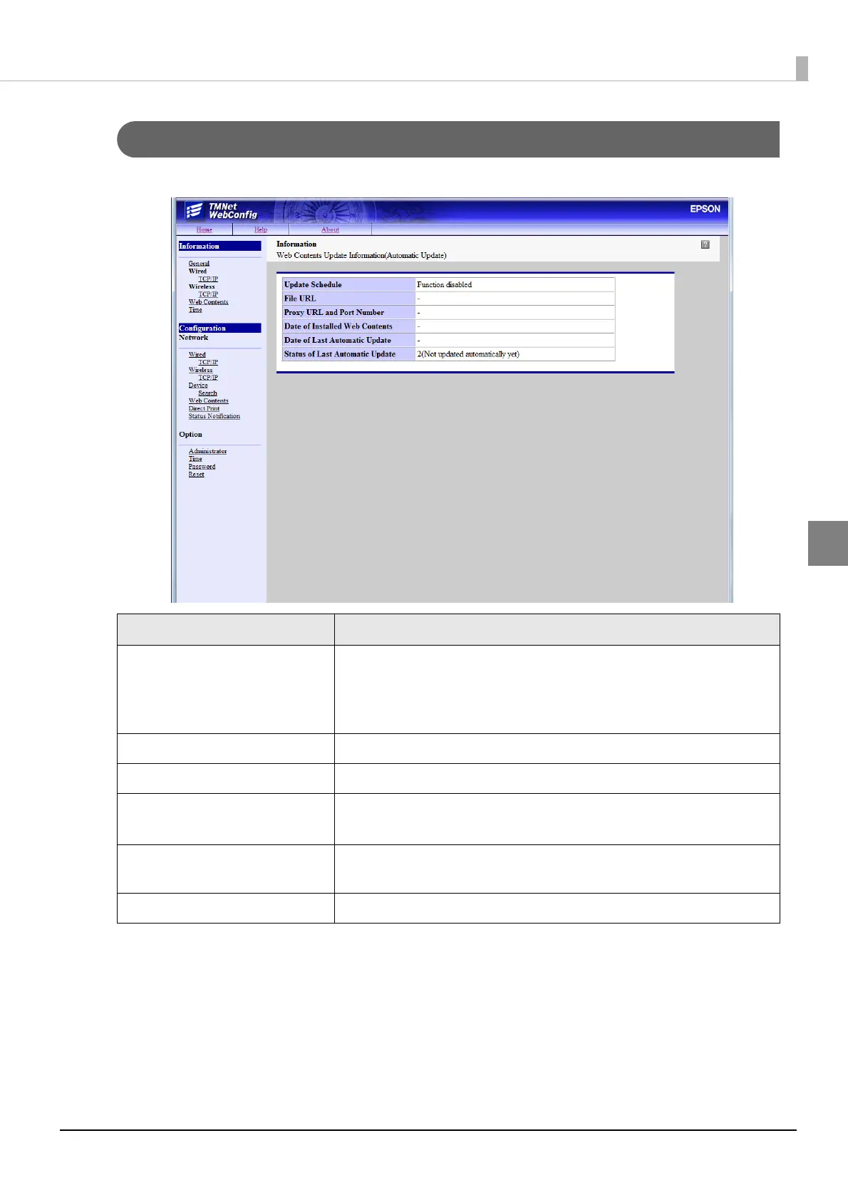 Status of Last Automatic Update Shows the result of the last update of web contents on the TM-T88V-i.