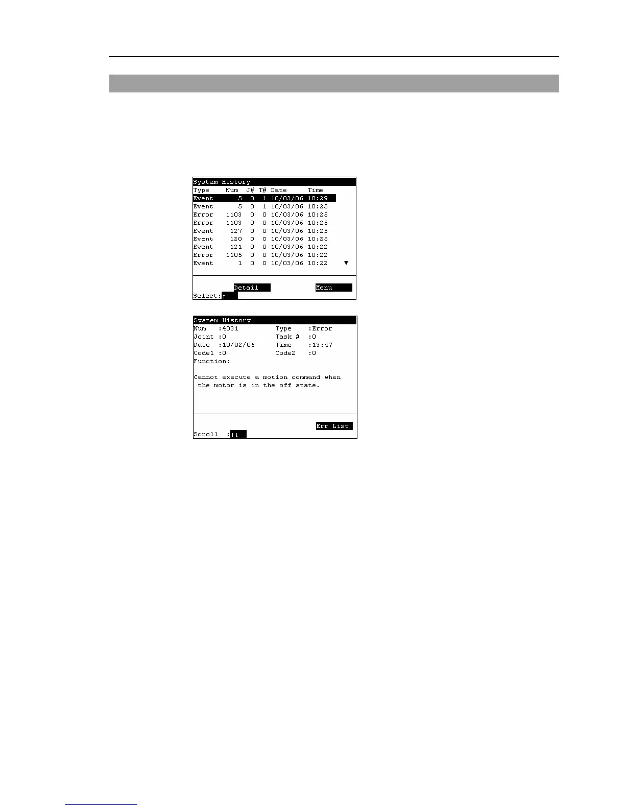 This screen displays a history of errors, operations and warnings that occurred in the past.