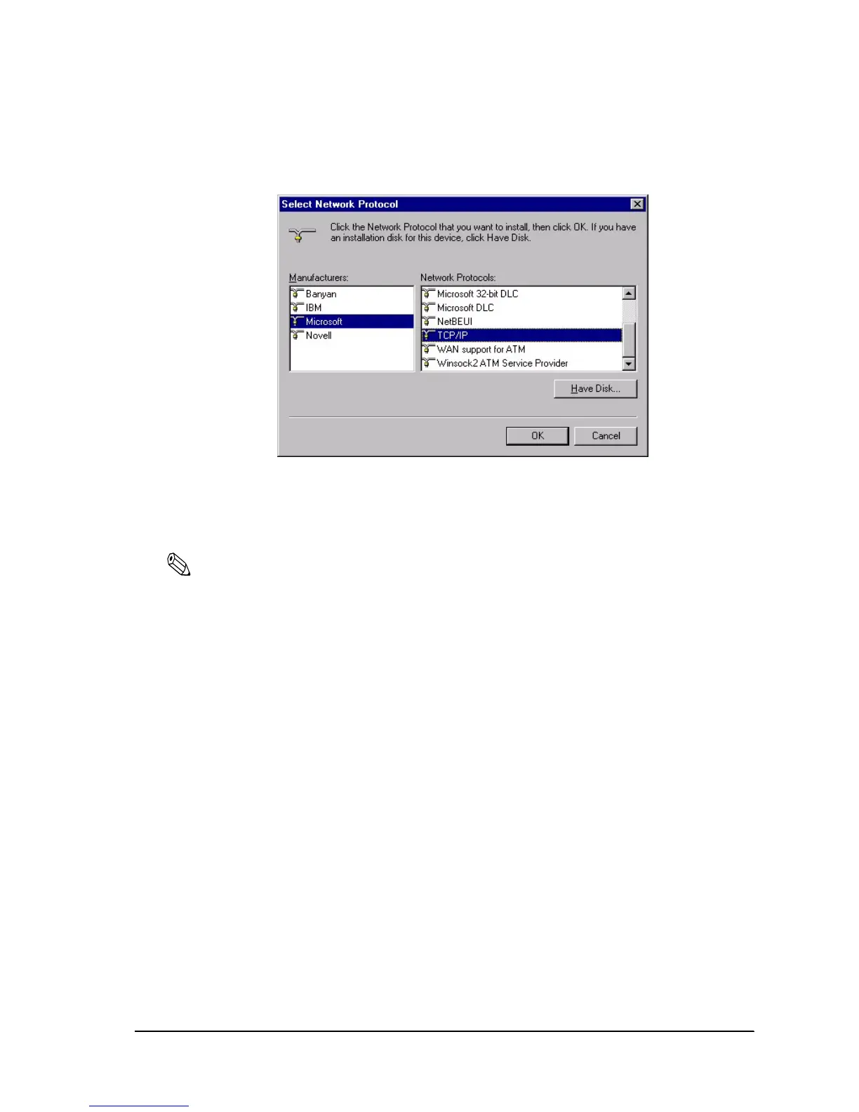 3. Select Microsoft from the list of manufacturers and TCP/IP from the Network protocols list.