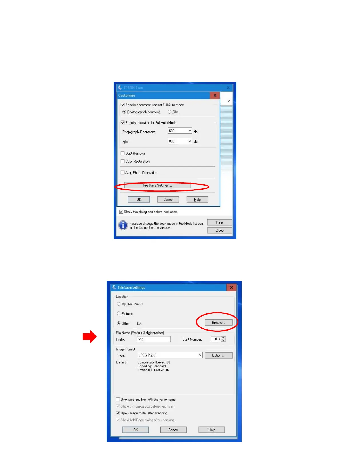 7. The File save settings window opens. First you will want to specify where you want to
