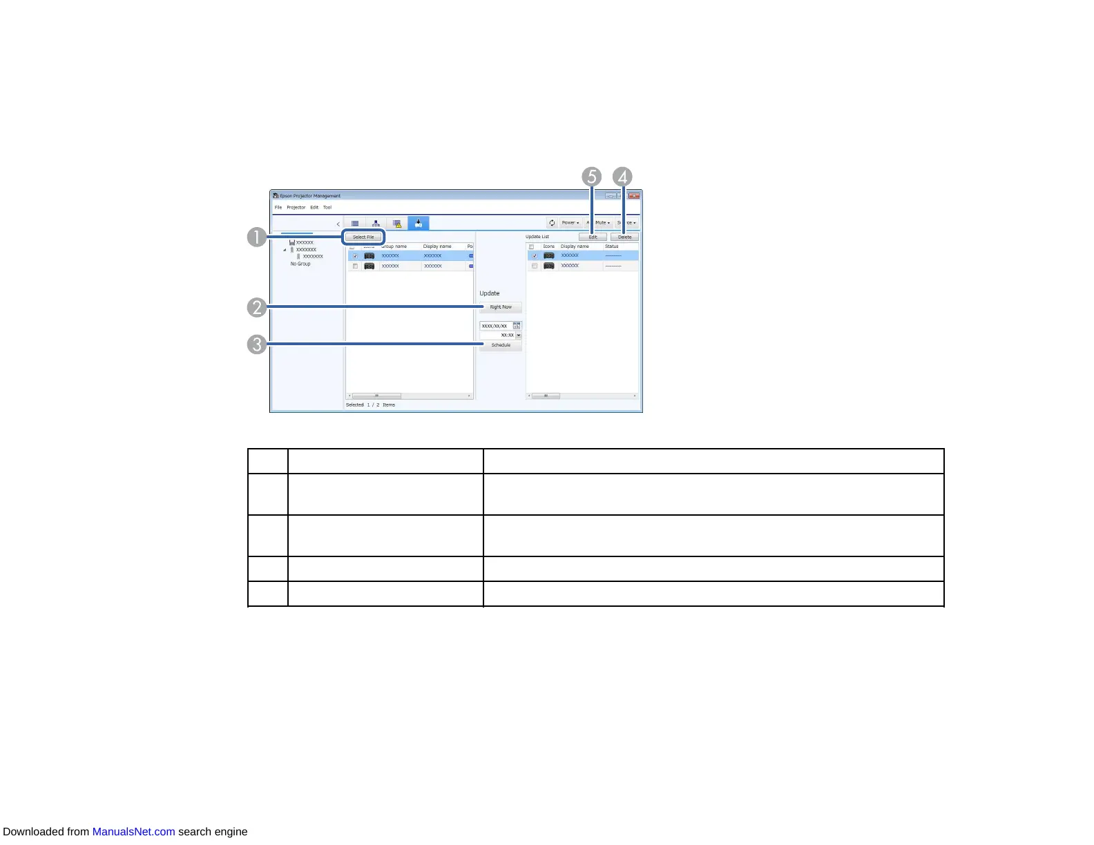 When you click the Update List icon on the Epson Projector Management main screen, the Update List