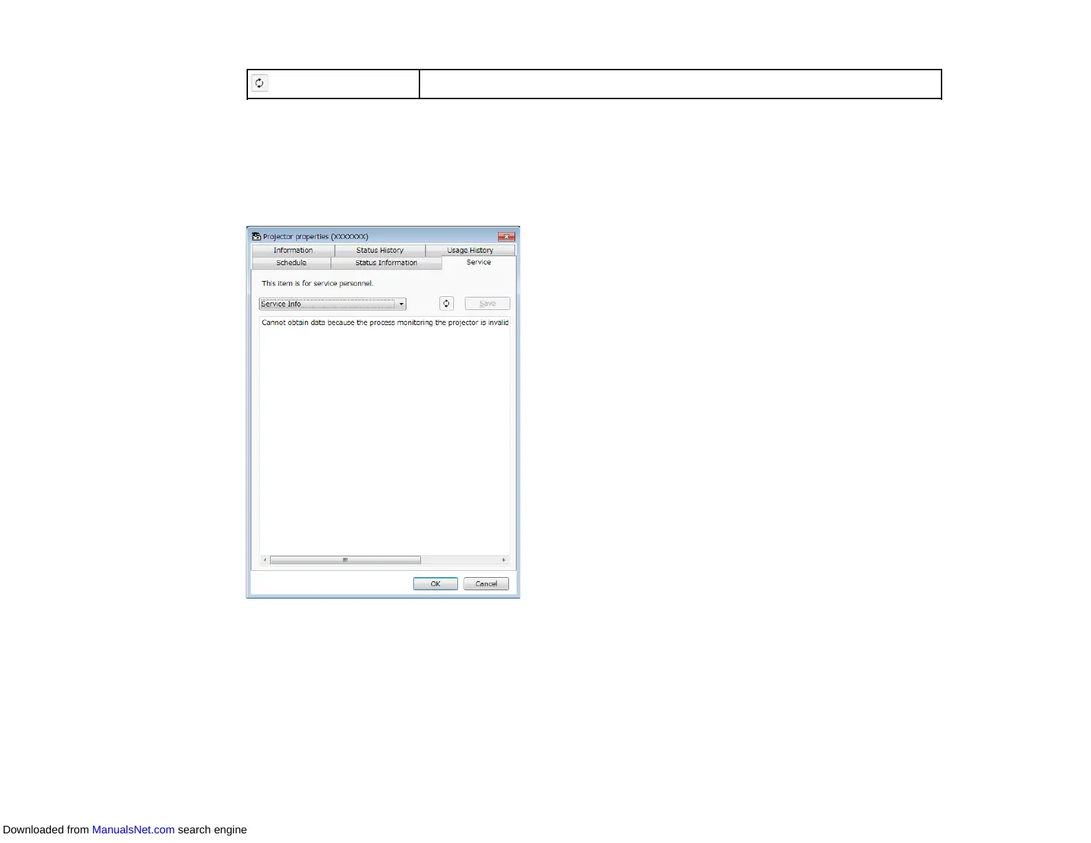 When you select the Service tab on the Projector properties screen, the following screen appears.