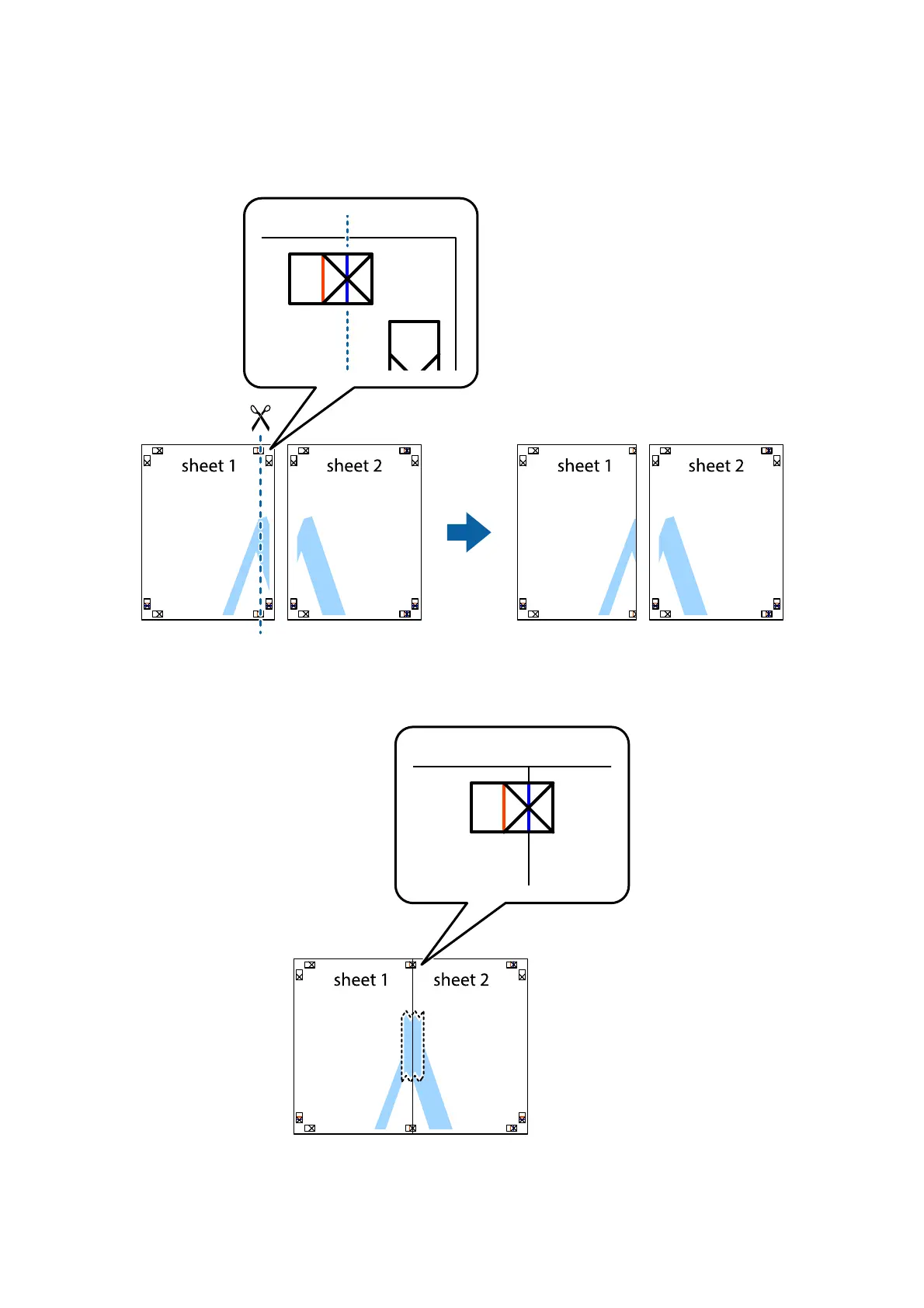 2. Place the edge of Sheet 1 on top of Sheet 2 and align the cross marks, then temporarily tape the two sheets