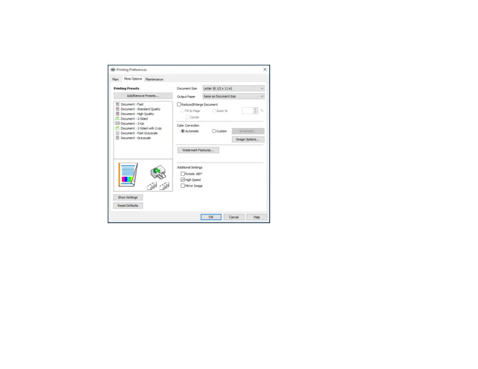 You can select a variety of additional layout and printing options for your document or photo on the More
