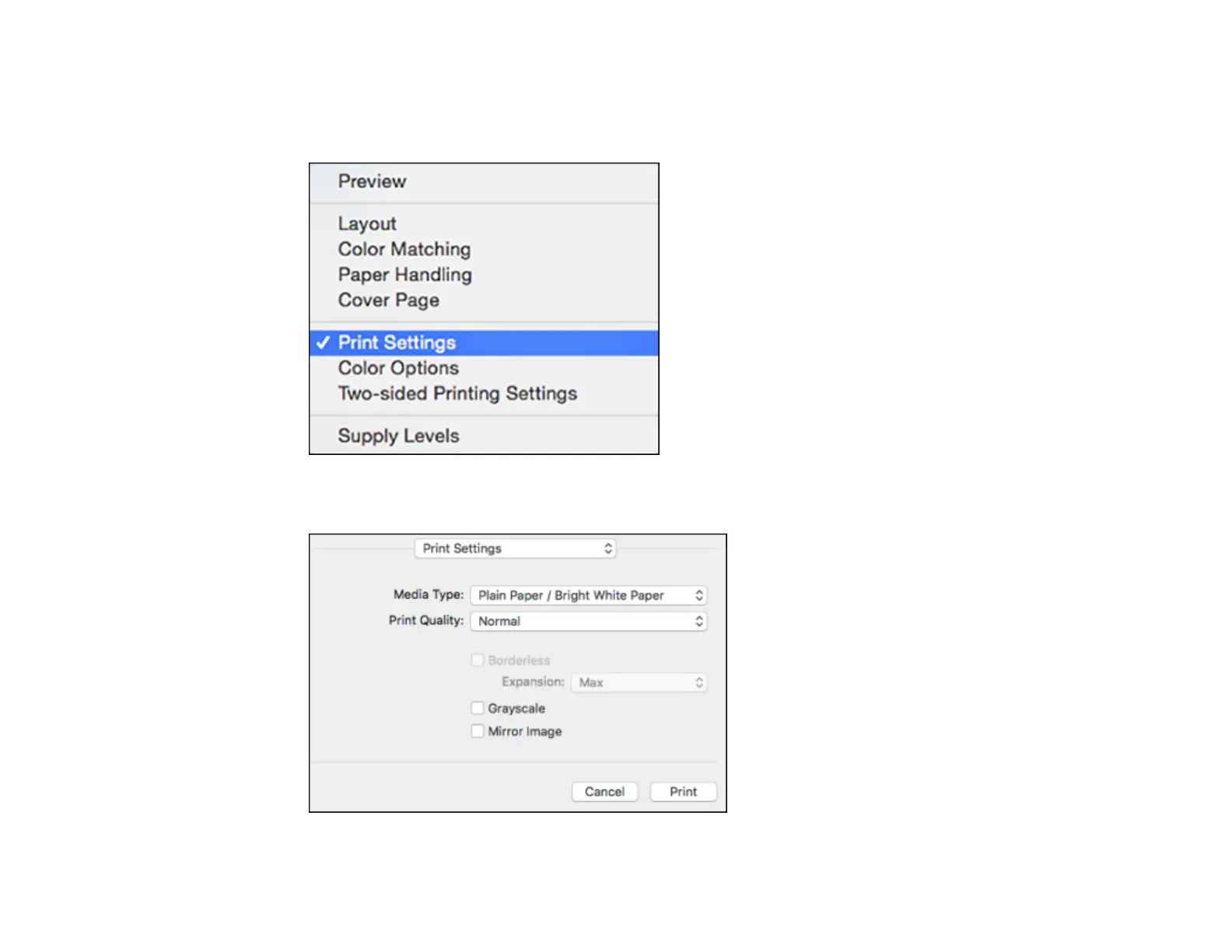 8. Select Print Settings or Printer Features from the pop-up menu.