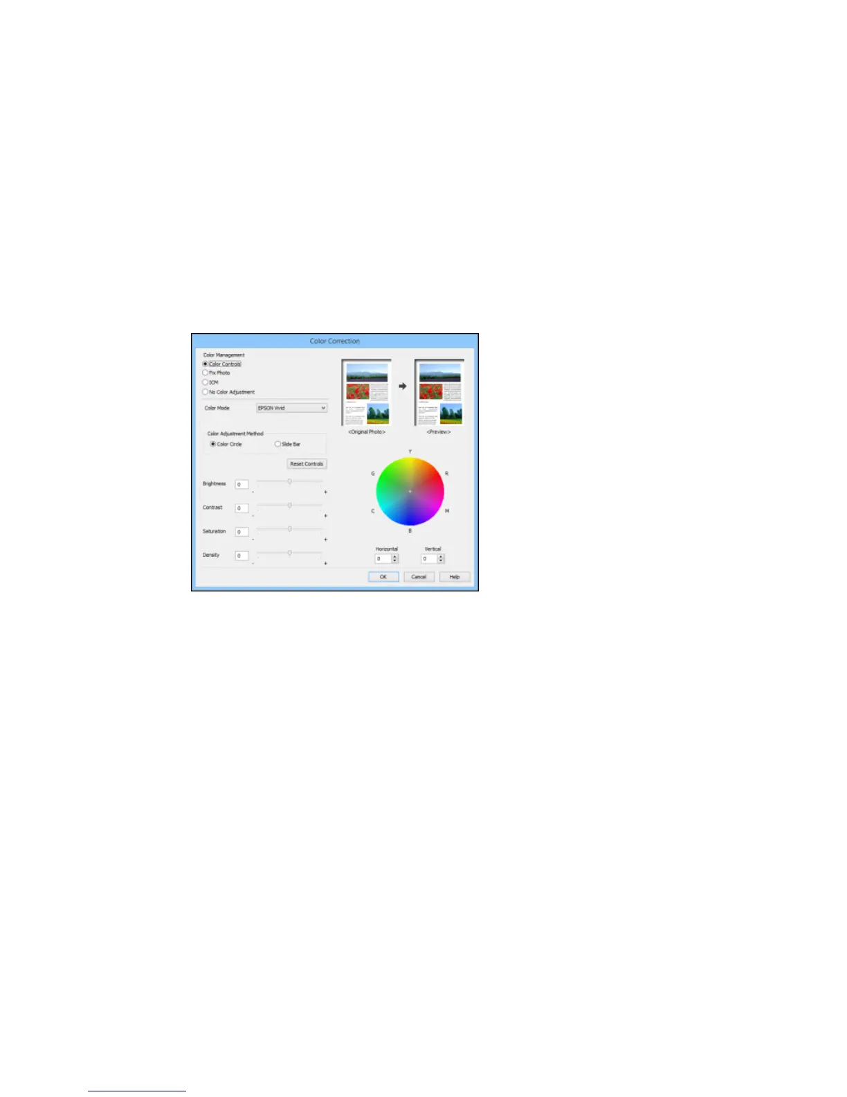 Lets you select a Color Mode setting, individual settings for Brightness, Contrast, Saturation, and