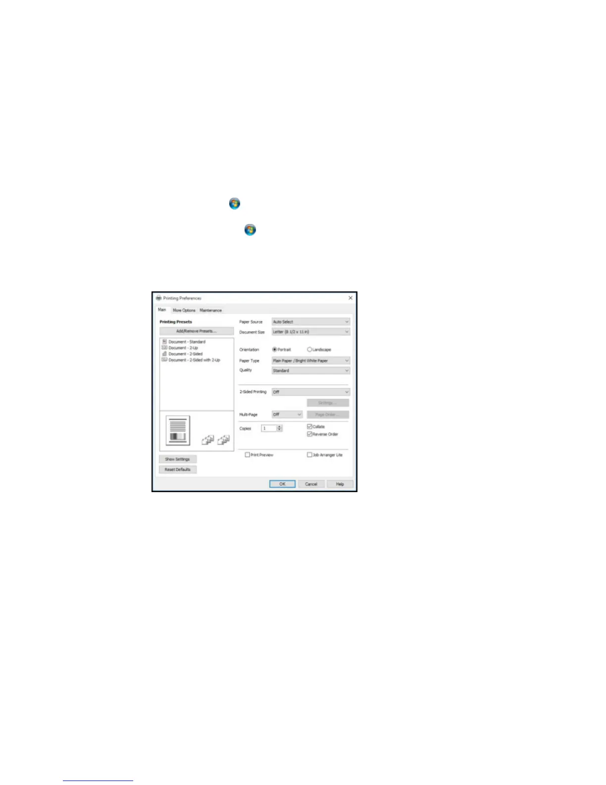 2. Select the print settings you want to use as defaults in all your Windows programs.