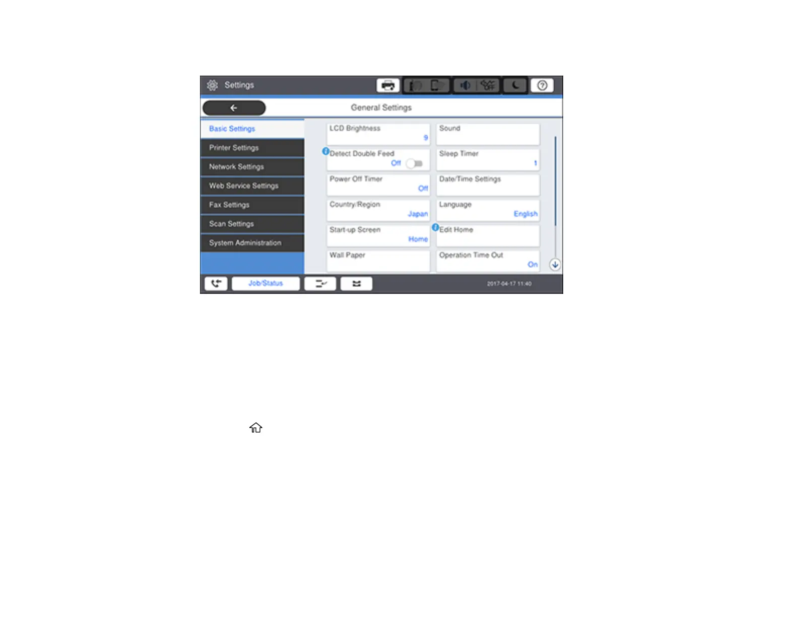 The Operation Time Out setting causes the LCD screen to return to the Home screen after a few minutes