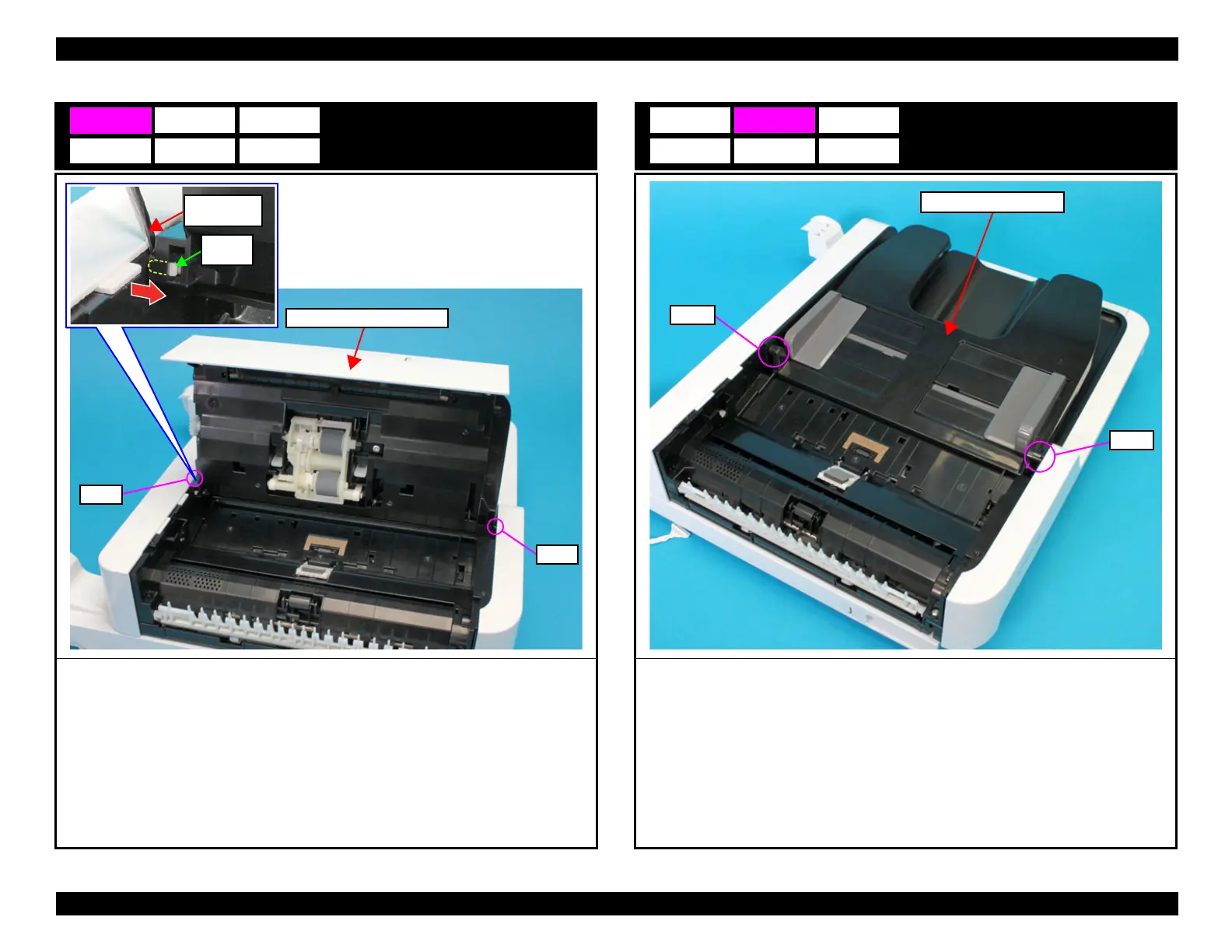 1. Disengage the two dowels of the ADF Document Support while bending it, then remove the