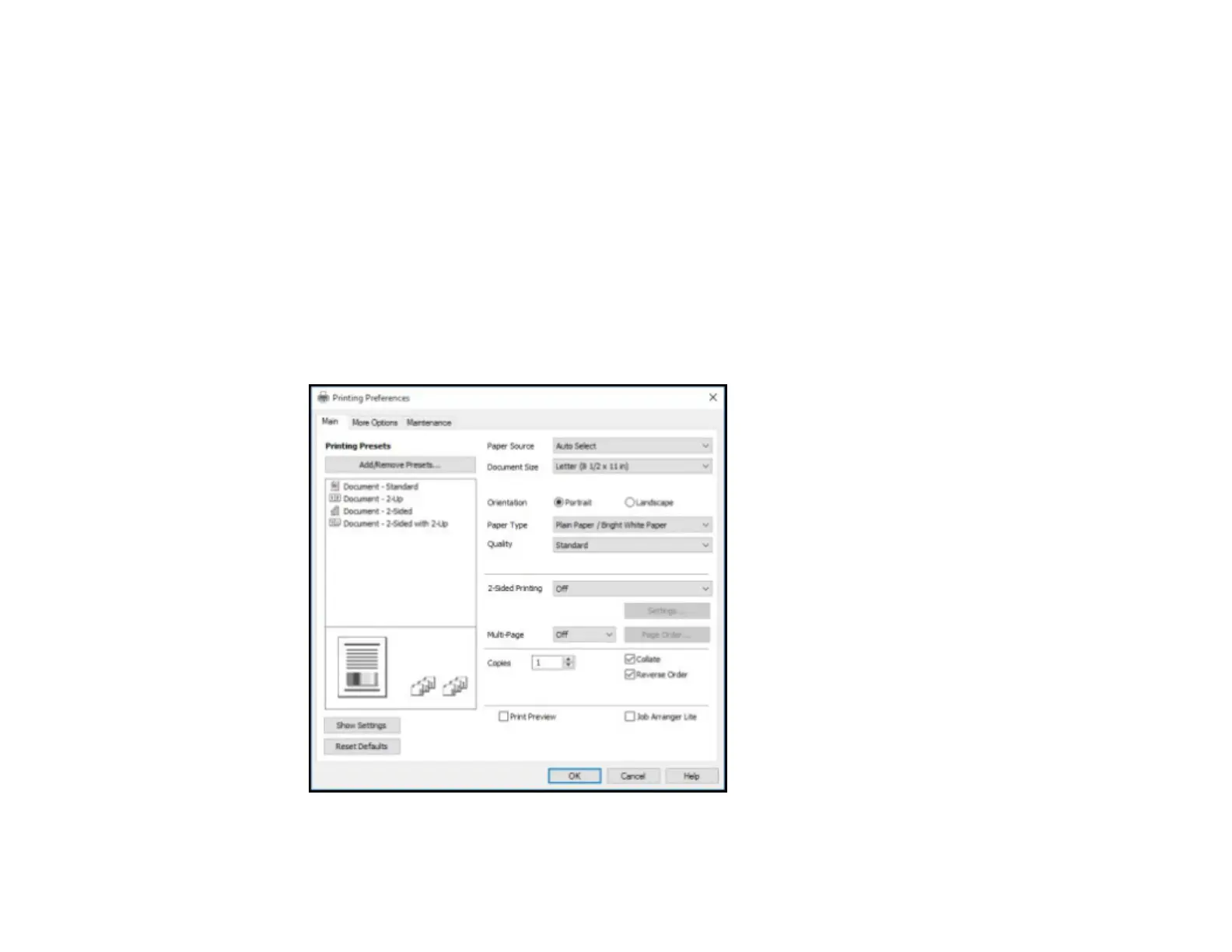 You see the Main tab of your printer settings window: