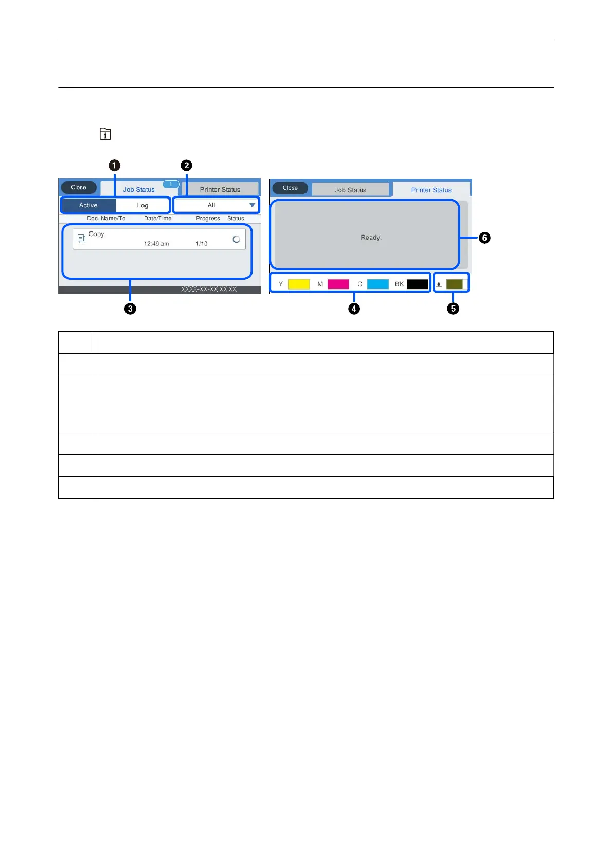 Press the button to display the Job/Status menu. You can check the status of the printer or the jobs.
