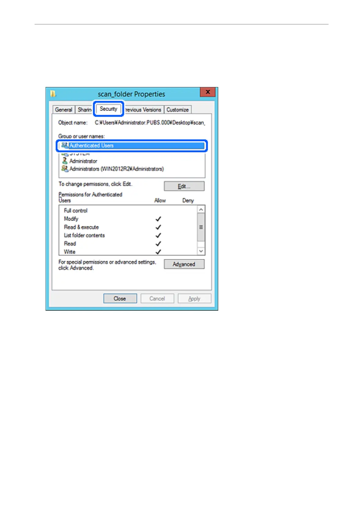 Select Security tab, and then select Authenticated Users on the Group or user names.