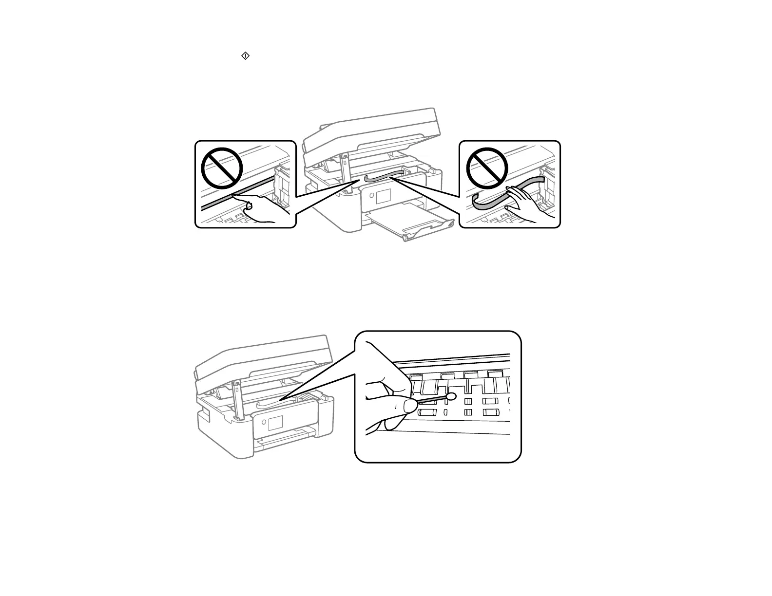 Caution: Do not use tissue paper to clean the inside of the product as lint can clog the print head
