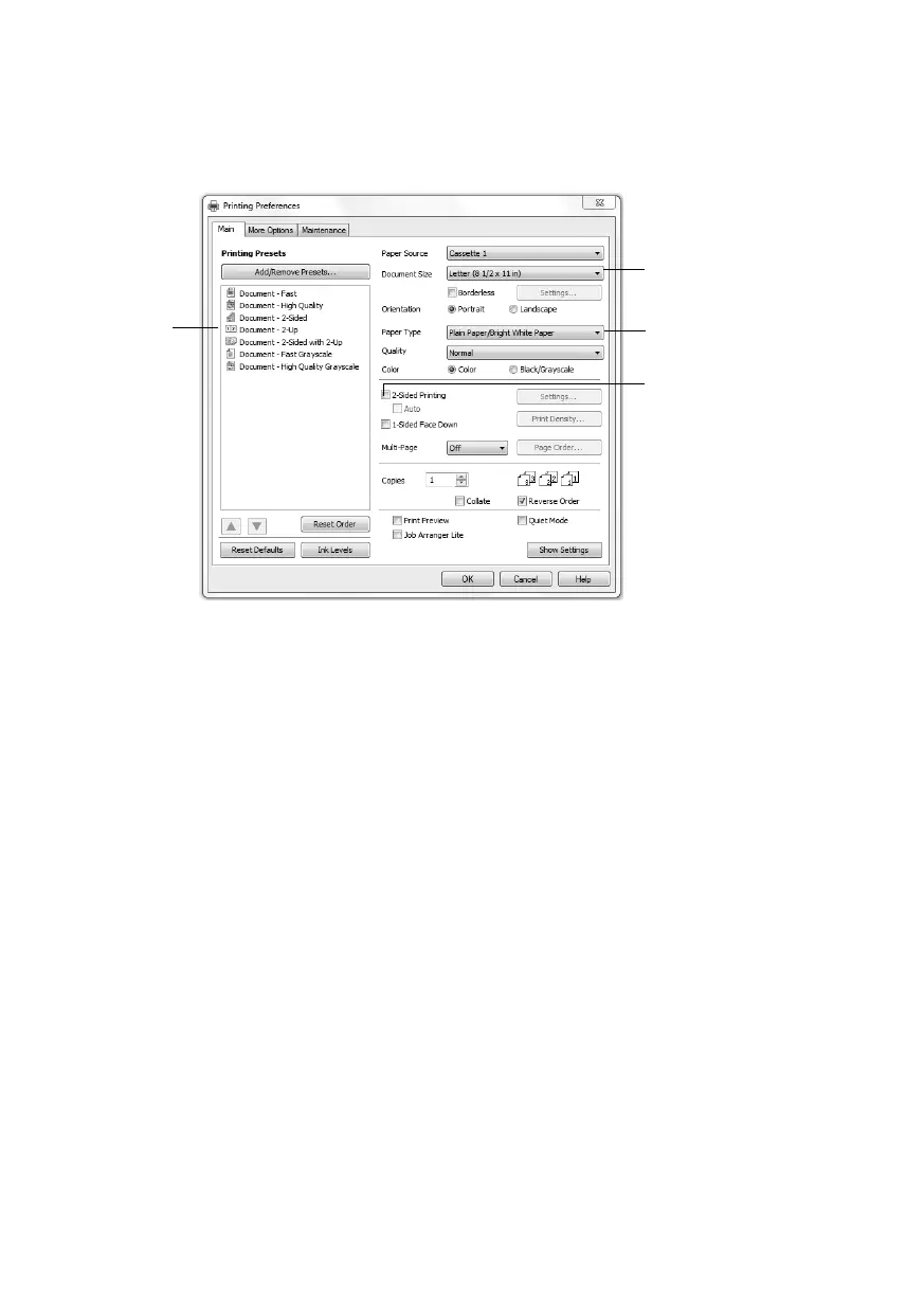 3. On the Main tab, select basic print settings. Make sure you choose the correct