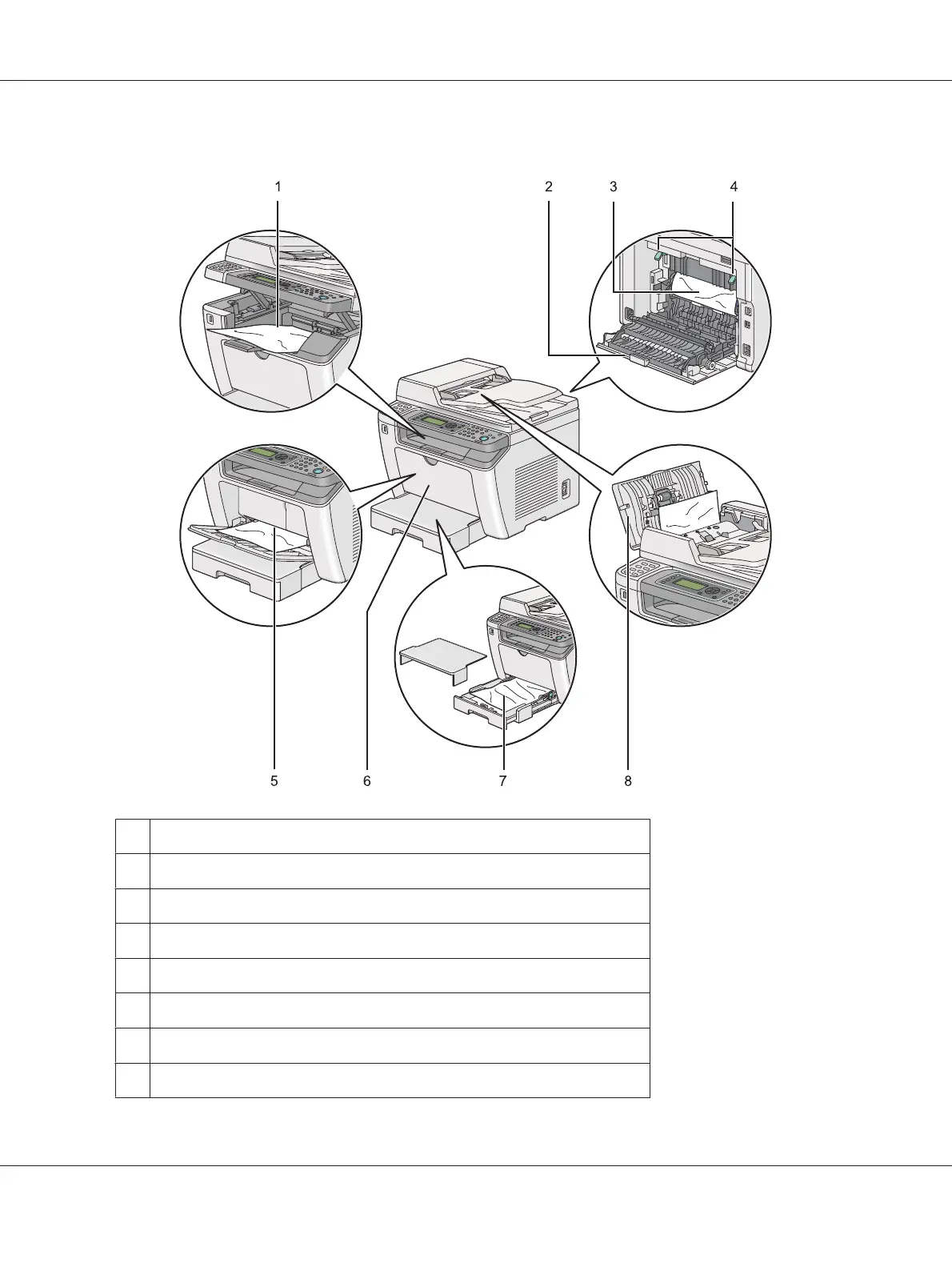 The following illustration shows where paper jams may occur along the print media path.