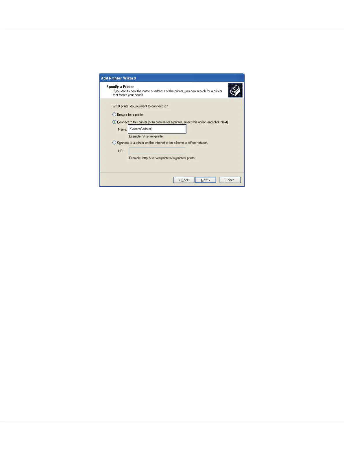 6. Select the printer, and then click Next. If the printer is not listed, click Back and enter the path to