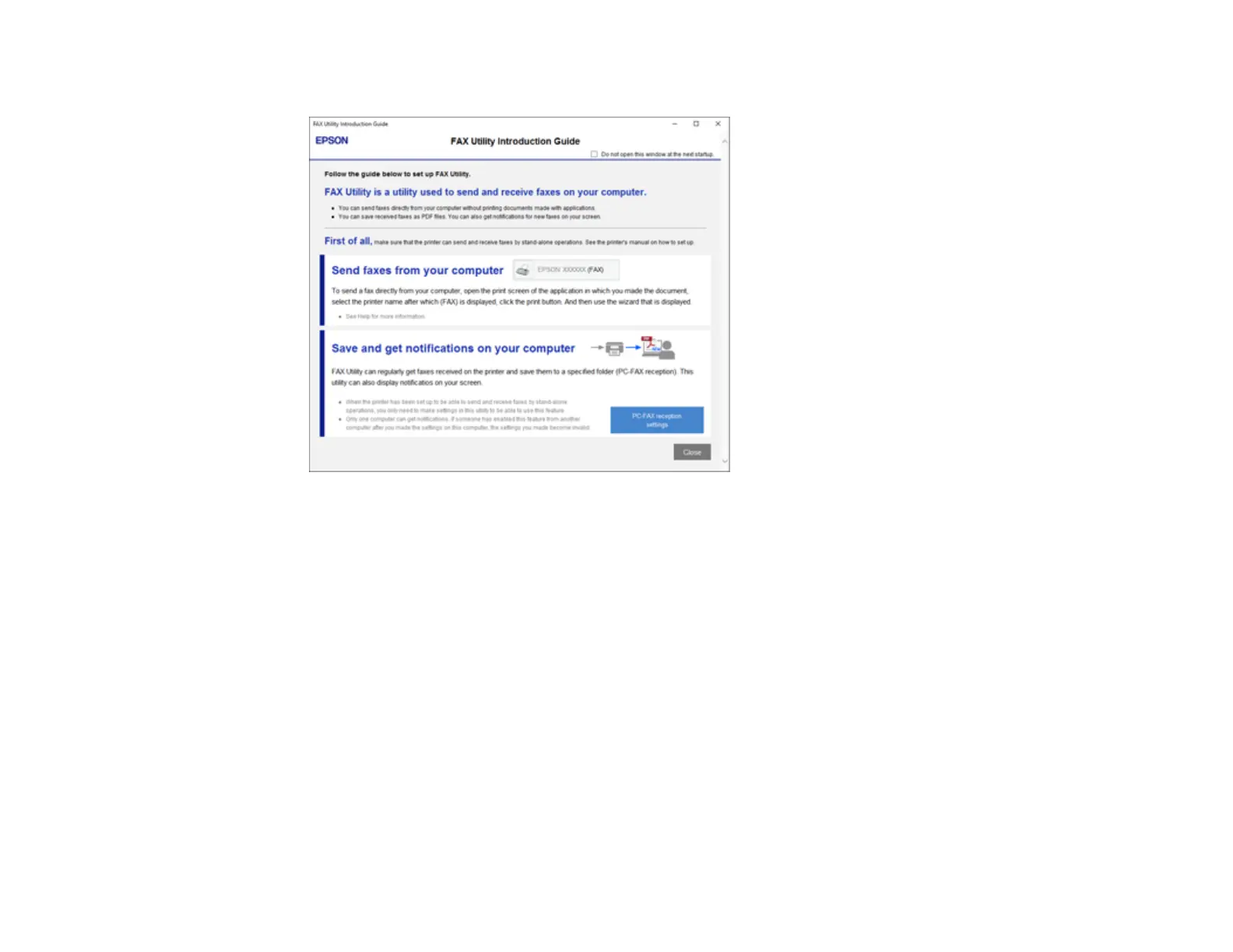 3. Read about the FAX Utility and click Close at the bottom of the window.