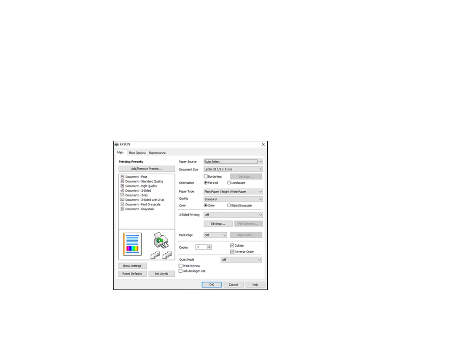 You see the Main tab of your printer settings window: