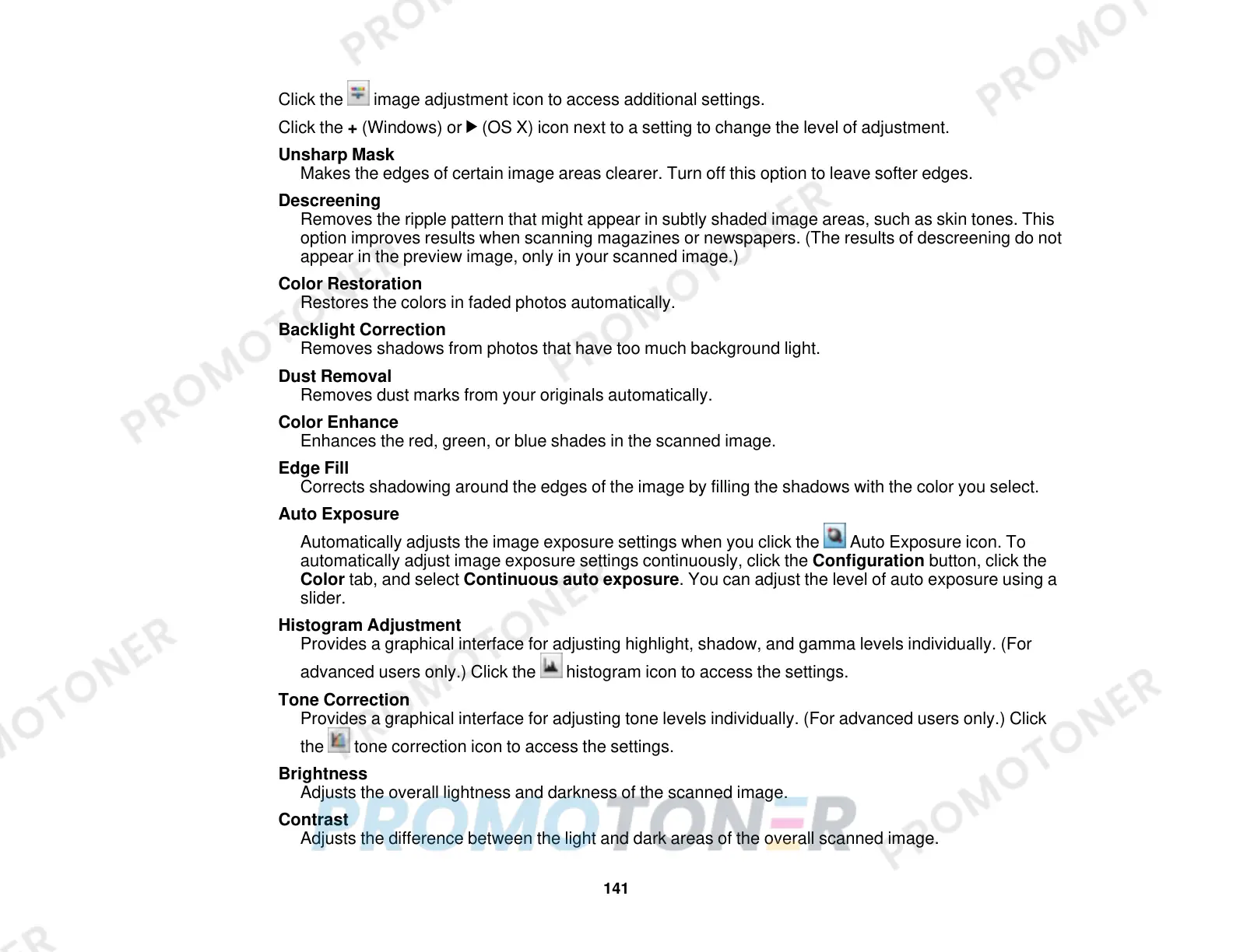 Adjusts the overall lightness and darkness of the scanned image.