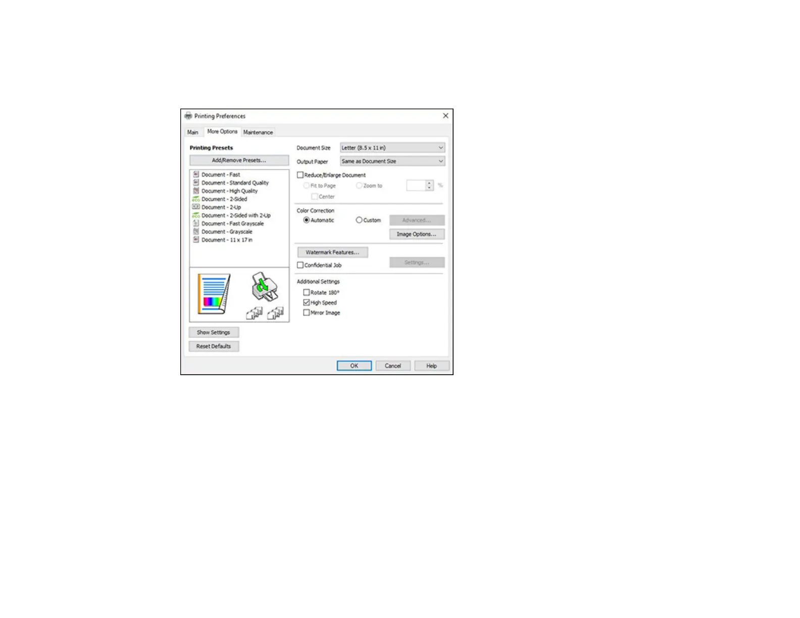 You can select a variety of additional layout and printing options for your document or photo on the More