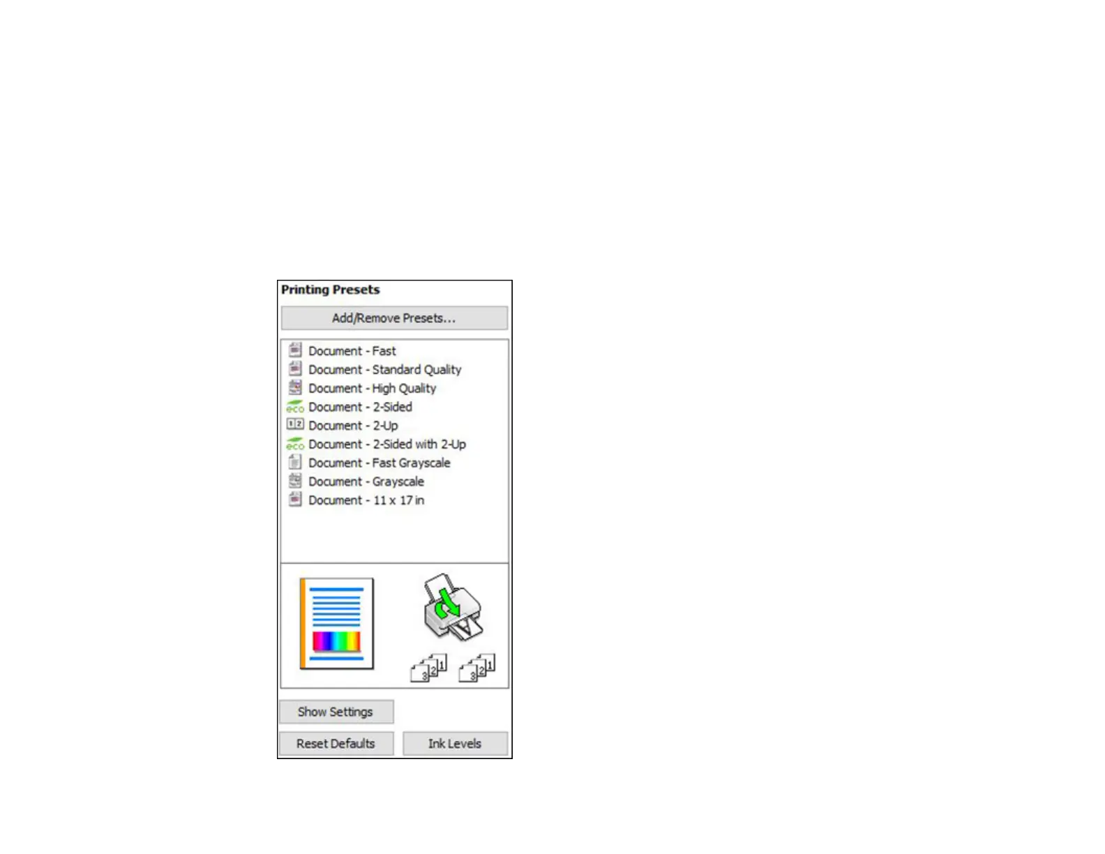 For quick access to common groups of print settings, you can select a printing preset on the Main or