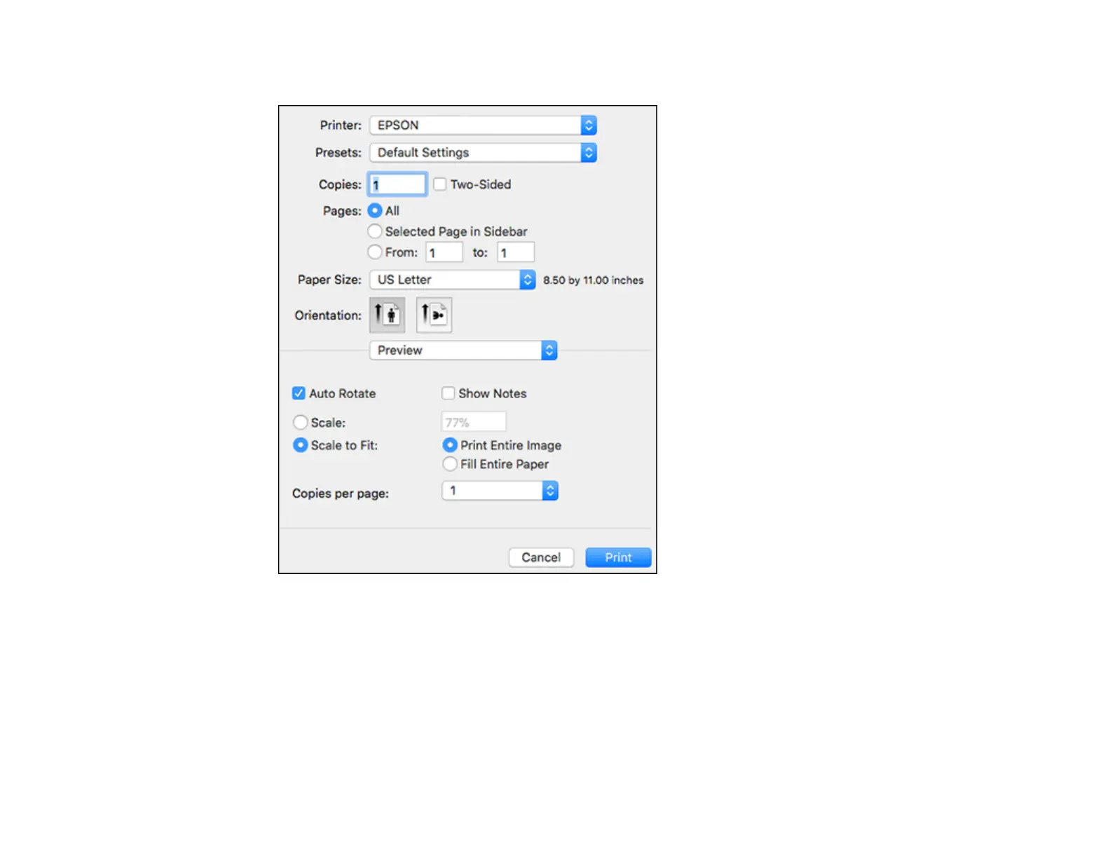Note: The print window may look different, depending on the Mac OS version and the application