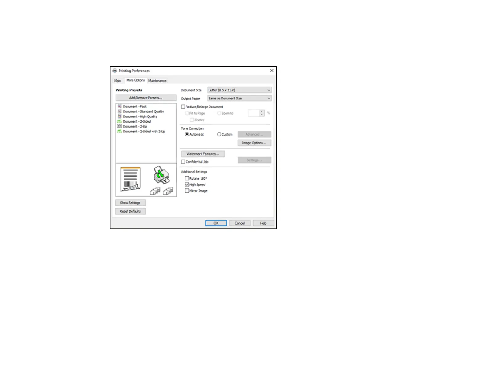 You can select a variety of additional layout and printing options for your document or photo on the More