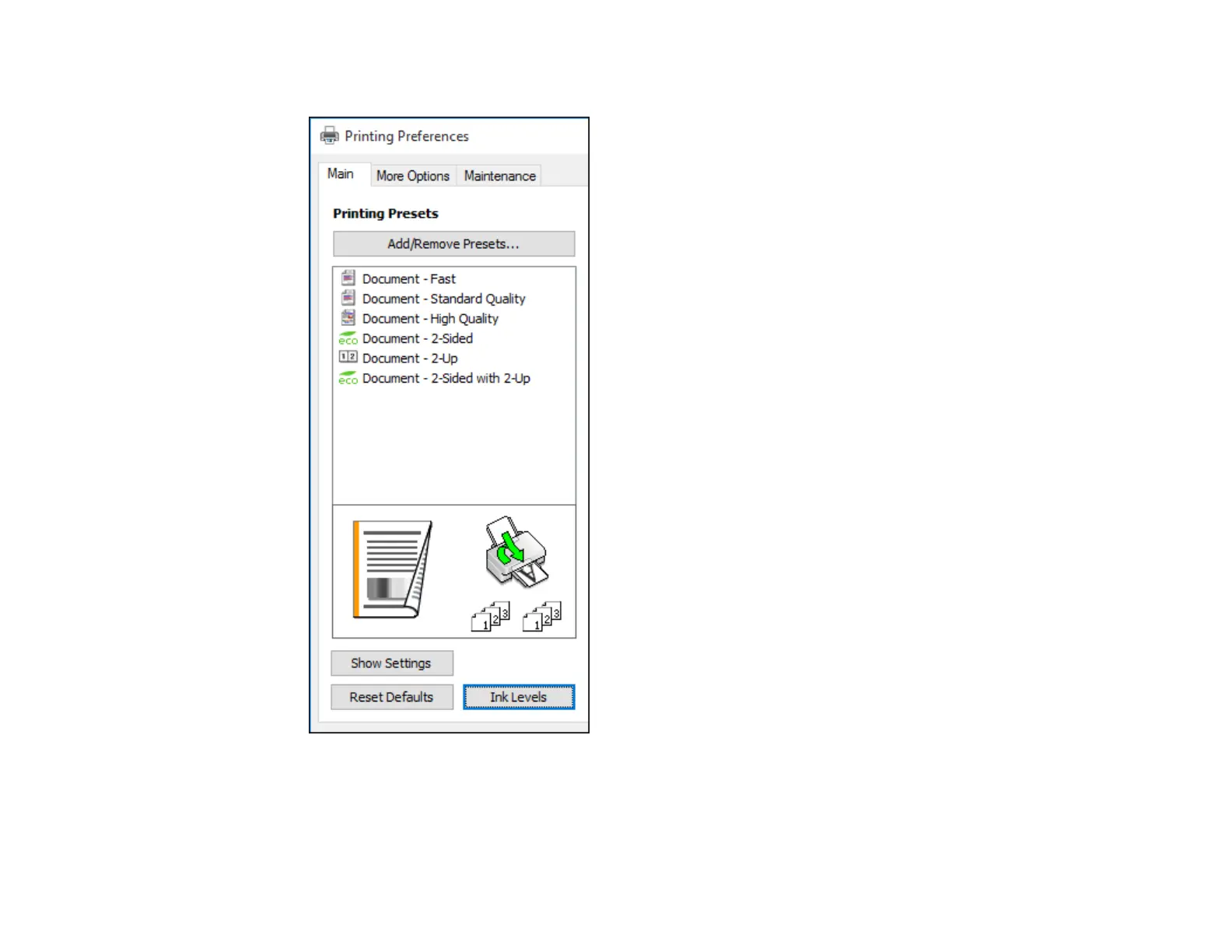 2. Place your cursor over one of the Printing Presets to view its list of settings.