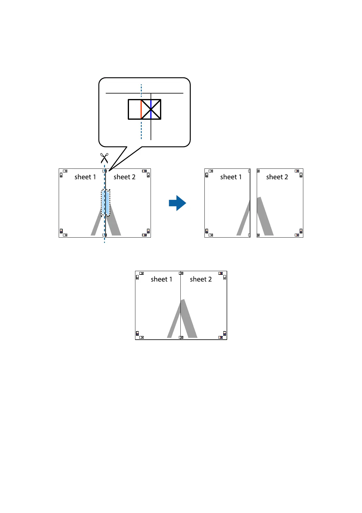 3. Cut the taped sheets in two along the vertical red line through the alignment markers (this time, the line to the