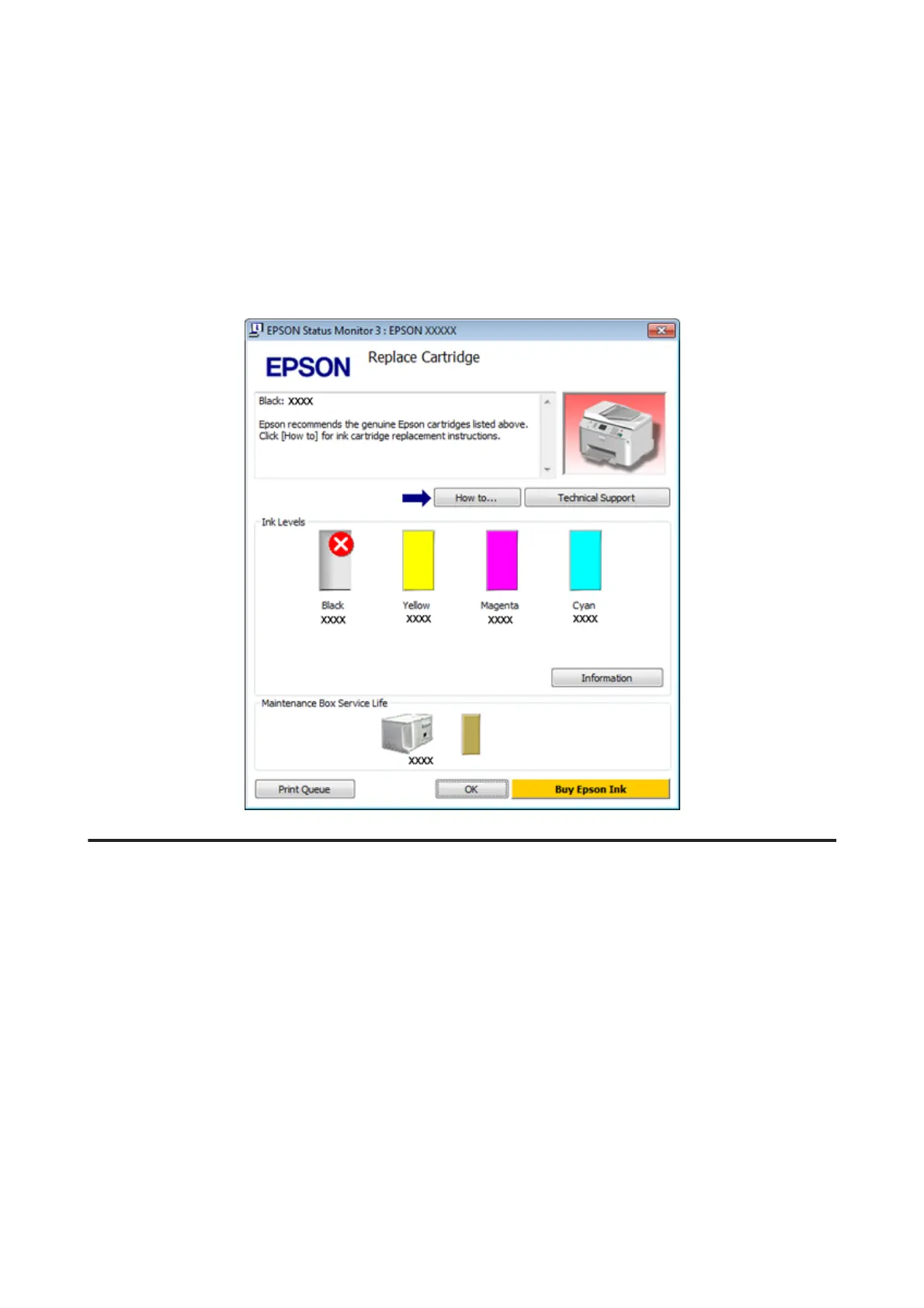 When the ink is low/expended or the maintenance box is nearly full/full, the How to button appears. Click How to, and