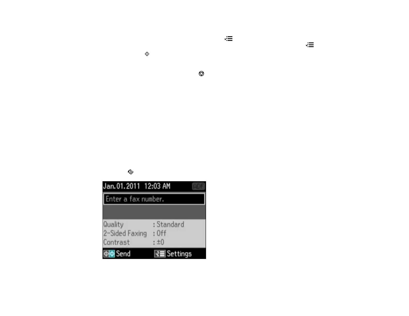 6. If you need to change any fax settings, press the Menu button, select Send Settings, press the