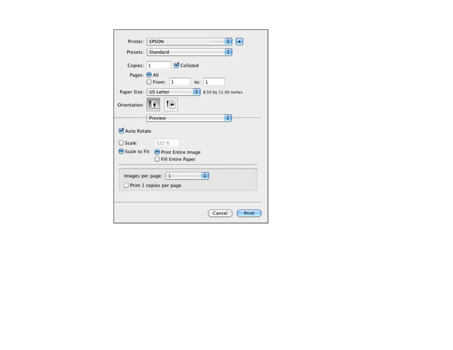 Note: The print window may look different, depending on the version of Mac OS X and the