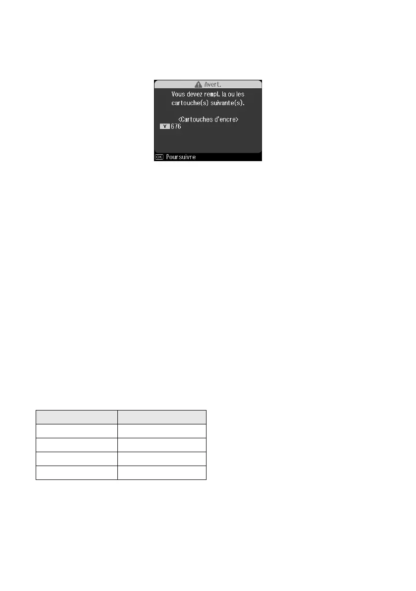 Lorsqu’une cartouche est épuisée, un message s’affiche sur l’écran ACL de l’imprimante :