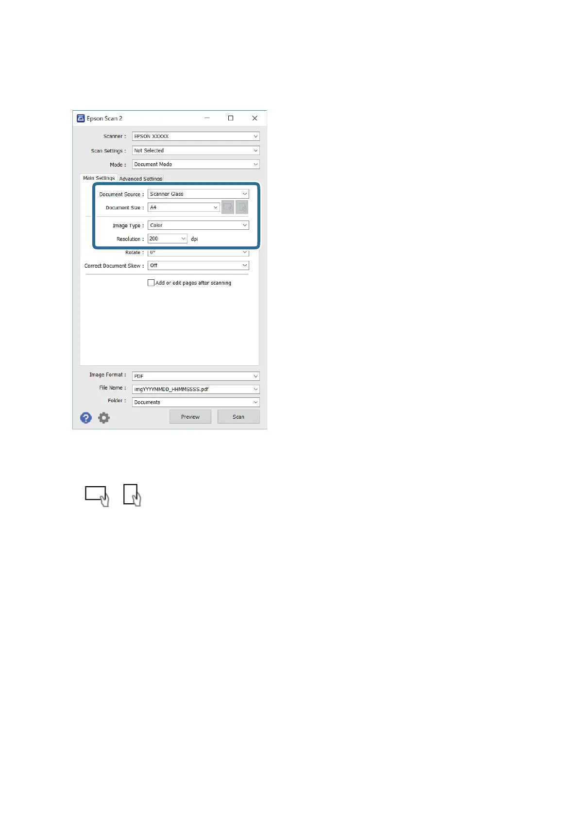 / (Original orientation) buttons: Select the set orientation of the original you placed.