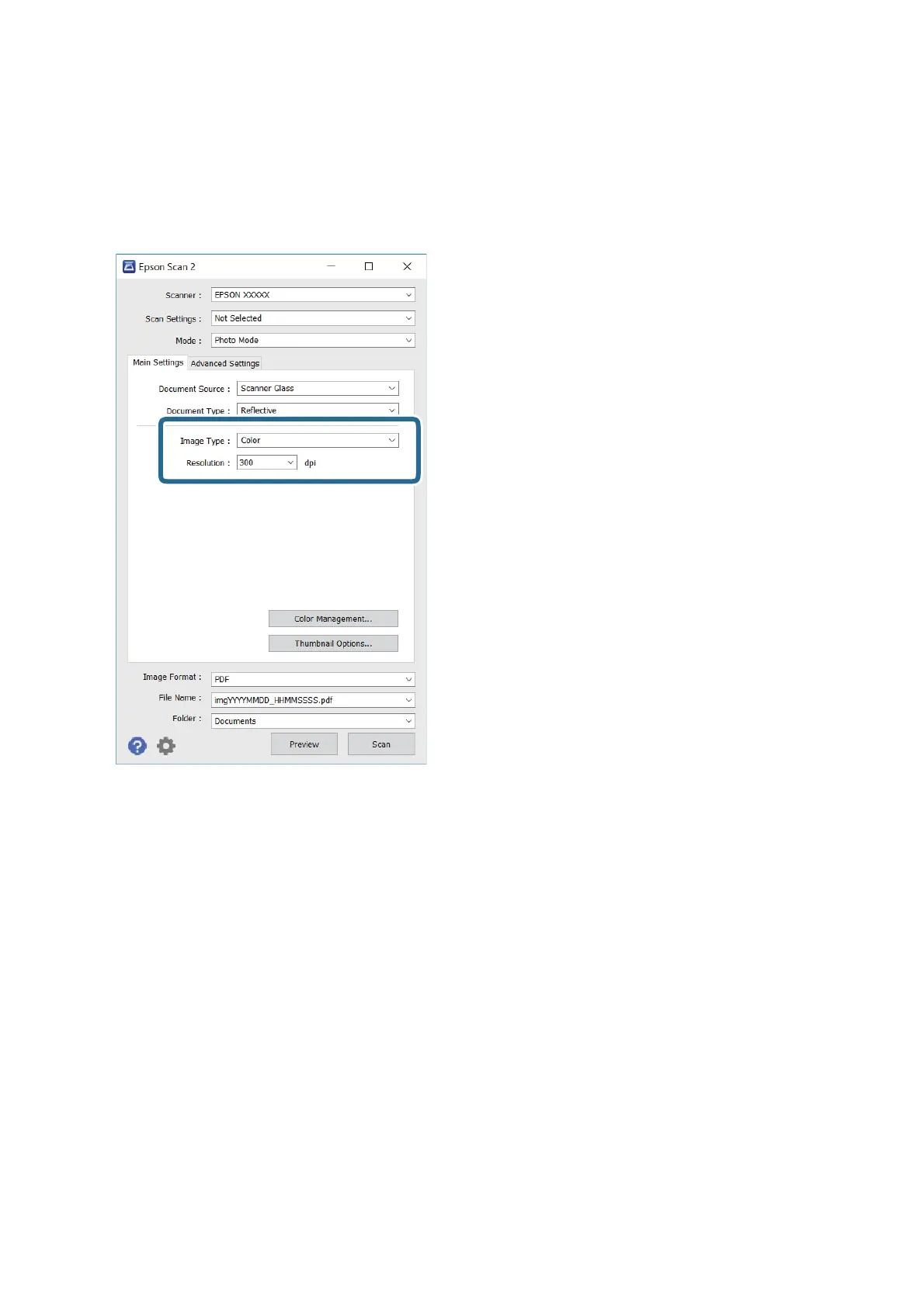 ❏ Image Type: Select the color for saving the scanned image.