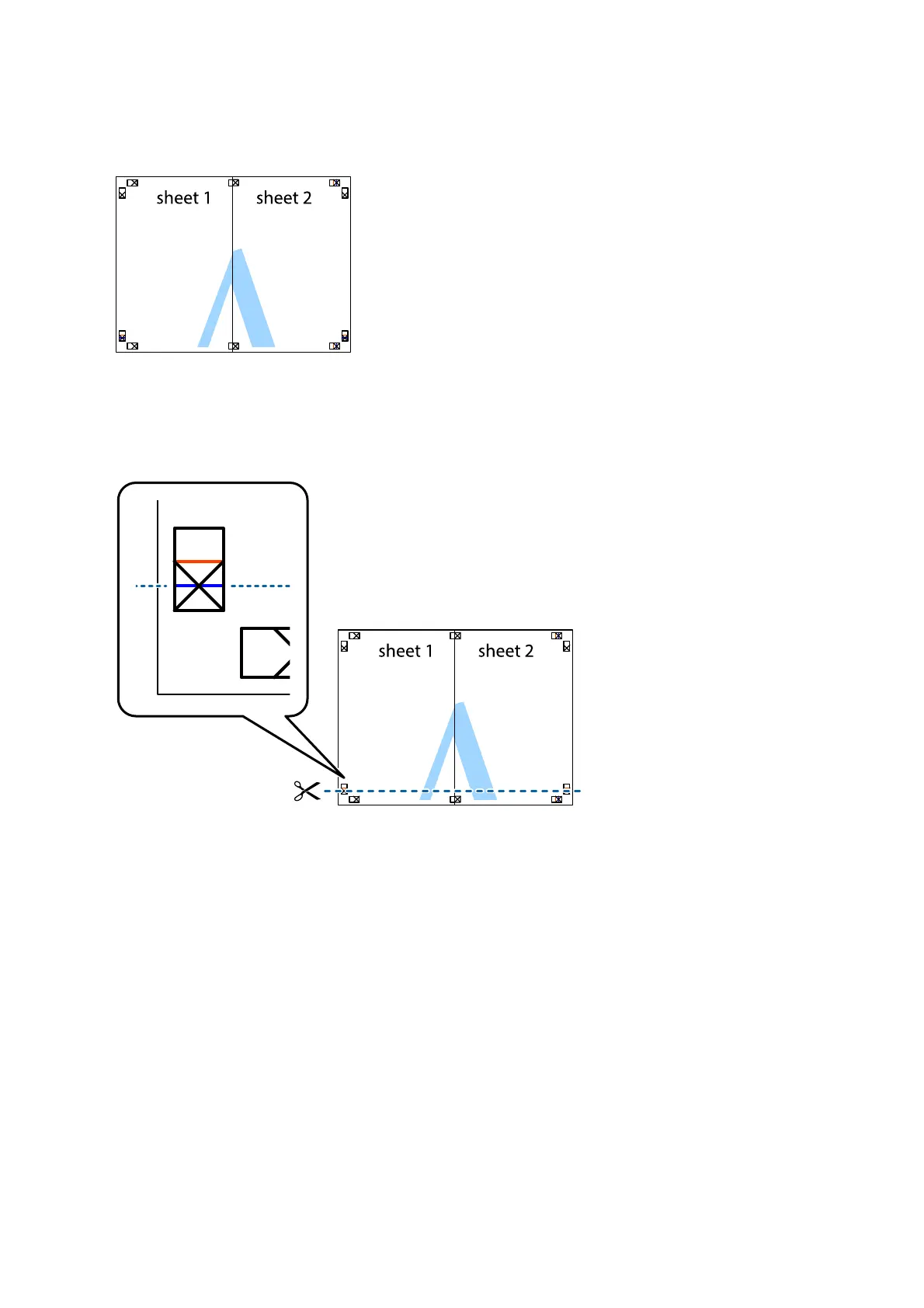 6. Cut o๎˜… the margins of Sheet 1 and Sheet 2 along the horizontal blue line through the center of the le๎˜„ and right