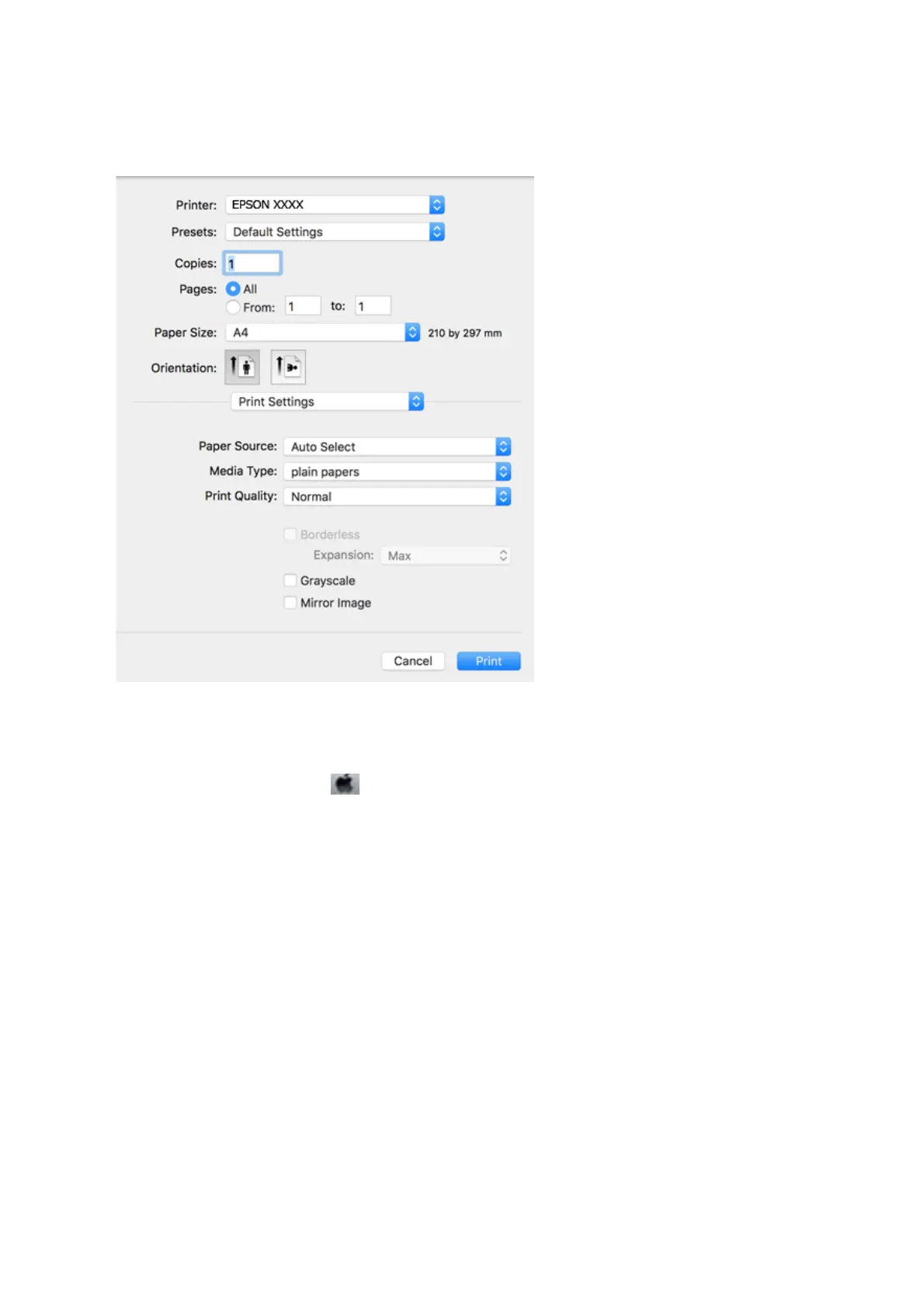 On OS X Mountain Lion or later, if the Print Settings menu is not displayed, the Epson printer driver has not been