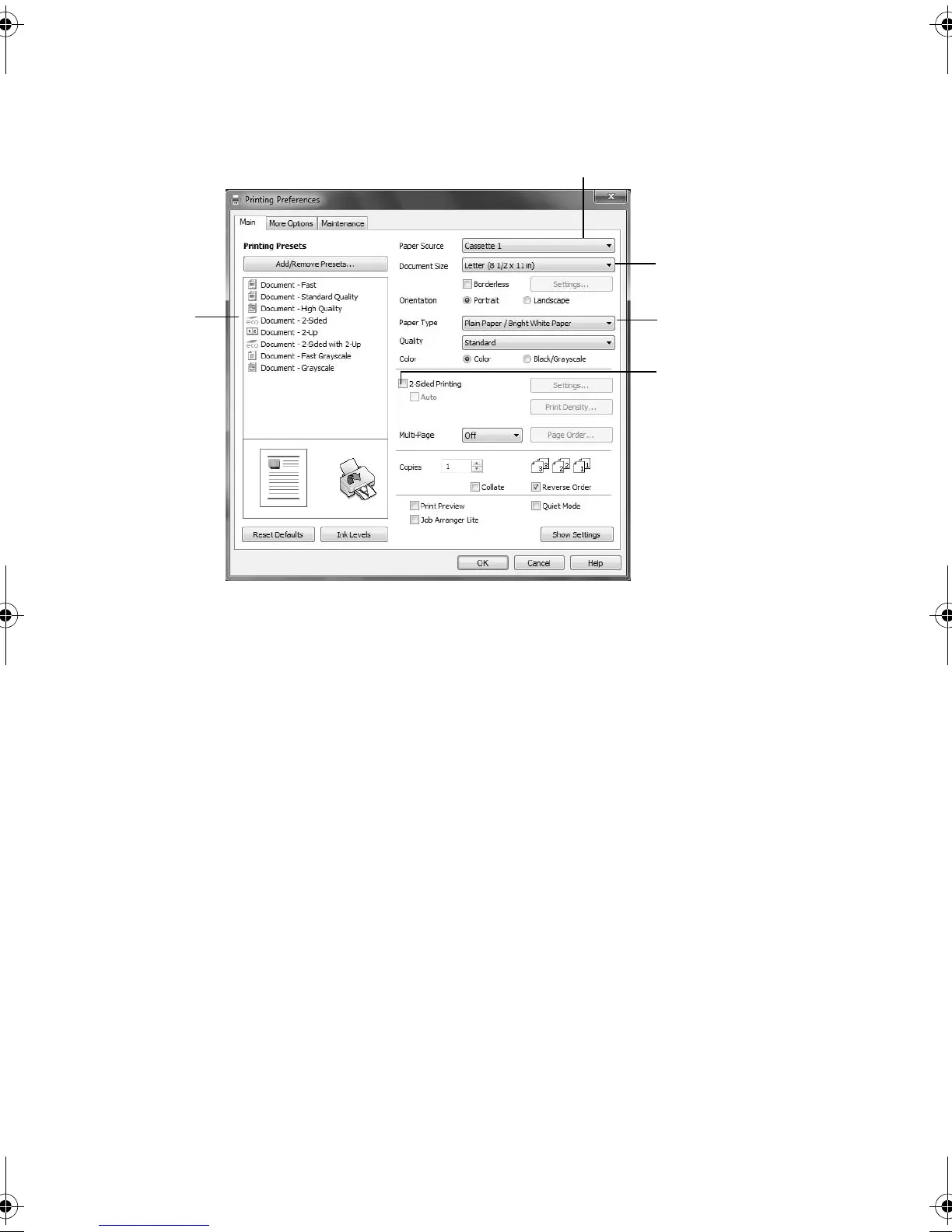 3. On the Main tab, select basic print settings. Make sure you choose the correct