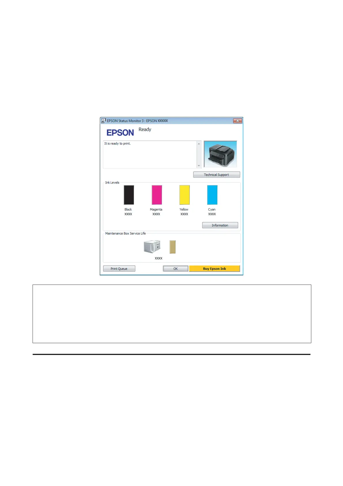 ❏ Open the printer driver, click the Maintenance tab, then click the EPSON Status Monitor 3 button. A graphic