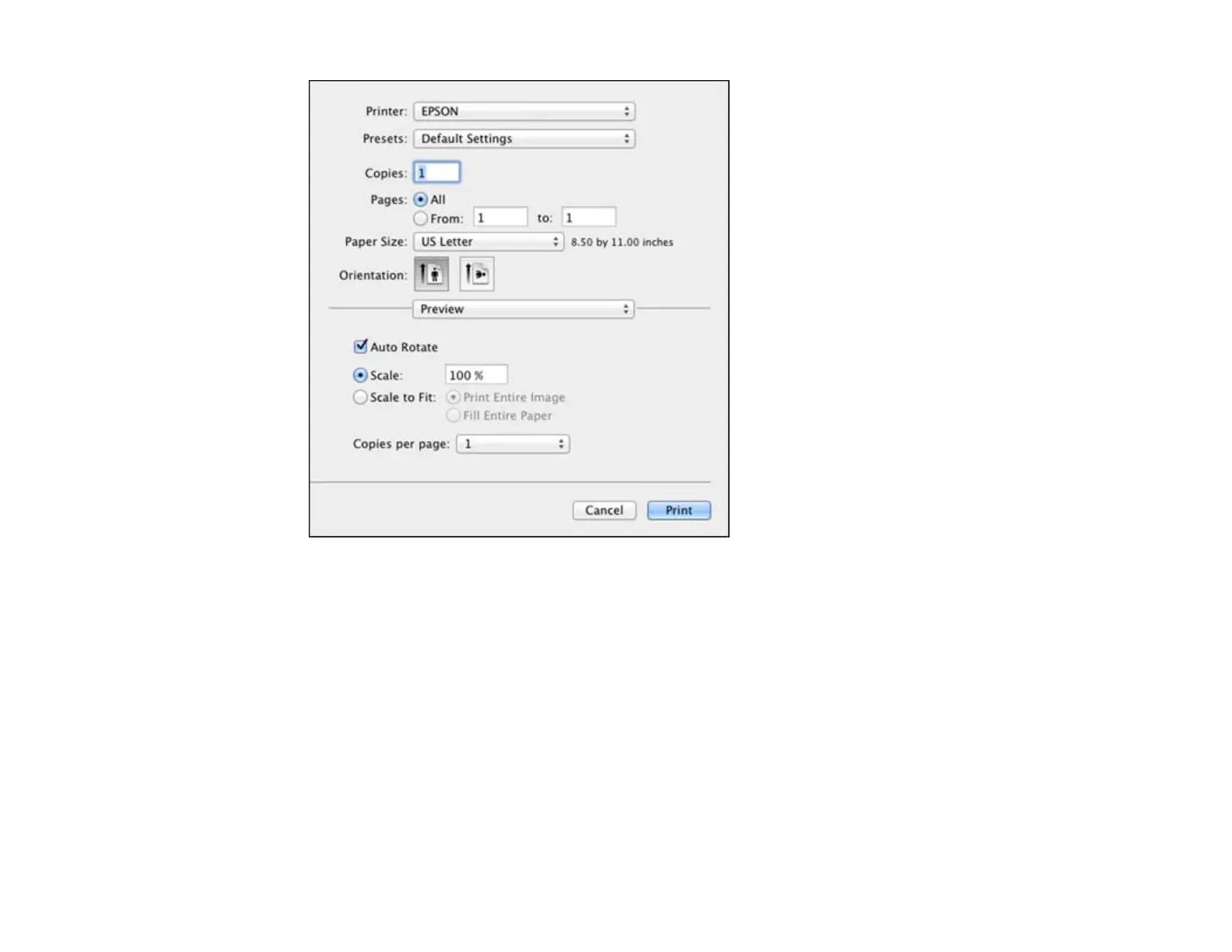 Note: The print window may look different, depending on the version of Mac OS X and the